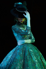 陳琦之chenqizhi 巴洛克主義 l 曾屬於⽂藝復興時代的璀璨星⾠,以及從莎⼠⽐亞筆下舶來的⾼雅⽓派,化身成點綴在發絲上的珠光,同時被喚醒,同時發⽣,同時訴說著屬於她的翩躚夢境。整個作品利用濃郁的色彩渲染,借以復古小禮帽、慵懶的小發卷和人物的神態對古典主義進行重新定義,呈現出文藝復興時期復辟風格的即視感,窈窕身形恍如委身於最尊貴的夜⾊,以最動⼈的身姿,傳遞藝術形式下的時空感及能量。在如絲夜晚,⼤放異彩。