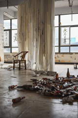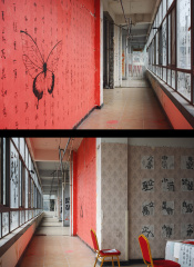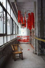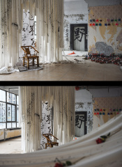 成都五块石“以颓为进”书法展,不同于平常那种高大上的艺术展馆,这个展厅居然布置在五块石的一栋废旧大楼中,充满了惊悚和神秘的氛围。