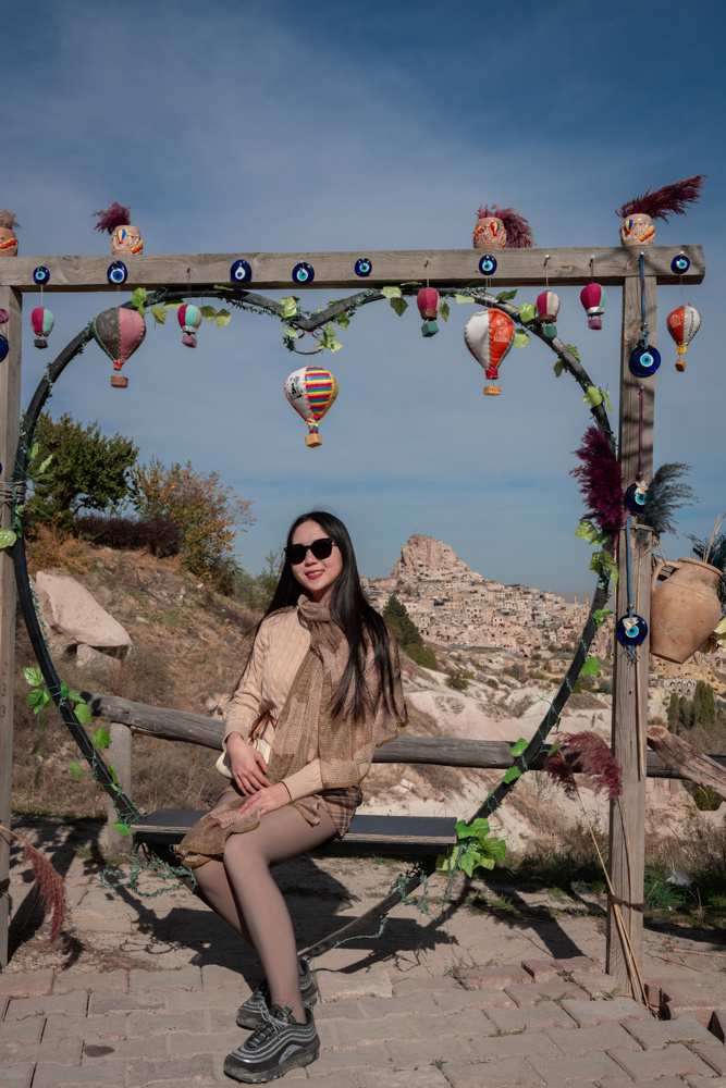 摄于2023.11.11土耳其卡帕多奇亚鸽子谷。土耳其鸽子谷是一个位于卡帕多奇亚地区的自然和人文景观。鸽子谷以其独特的喀斯特地貌而闻名,这里的岩石上布满了密密麻麻的鸽子洞,这些鸽子洞是由火山活动的凝灰岩、自然风化和侵蚀以及人类的开发共同作用形成的。鸽子谷的岩石形态各异,有的鸽子洞甚至有两层楼高。在山谷之上,有两棵古老的树木,其中一棵的树枝上挂满了被称为“蓝眼睛”的护身符,这是一种深受土耳其人喜爱的传统装饰品,被认为可以辟邪保平安。另一棵树上则挂满了陶瓷瓦罐。鸽子对于卡帕多奇亚穴居居民具有重要的文化意义和实用价值,它们不仅用于传信,而且还是重要的肥料来源。此外,鸽子谷也是规模最大的鸽子饲养环保区。图为一名中国姑娘在景区心形装饰物中留影。远处为乌奇萨尔城堡。