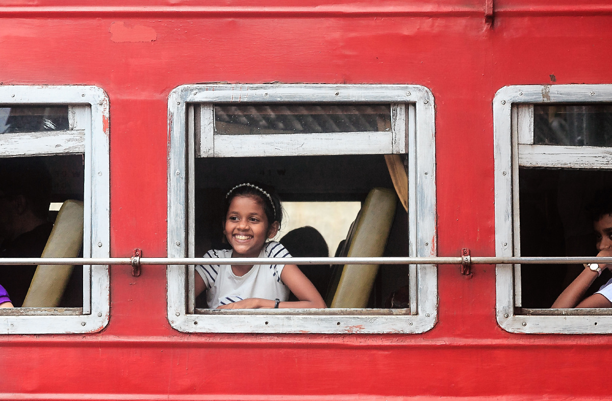 斯里兰卡茶山小火车上女孩微笑着看着窗外的美景。