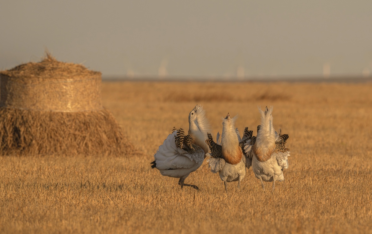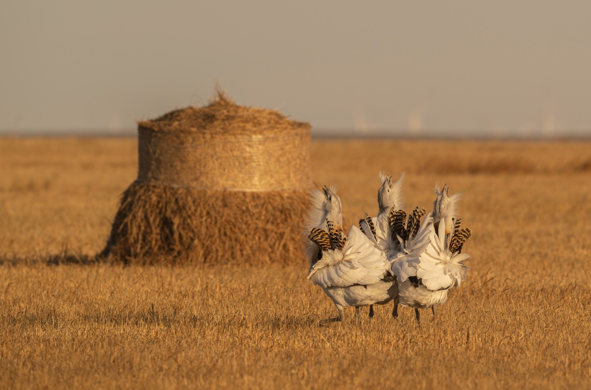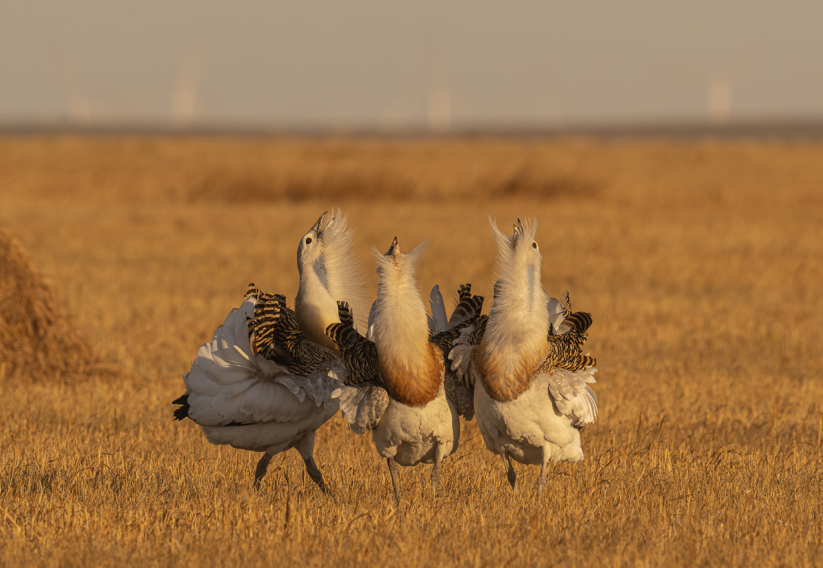 这是春天的大鸨雄性,在温暖的春天里,或翻花示爱,或几只一起翩翩起舞,以吸引雌性。