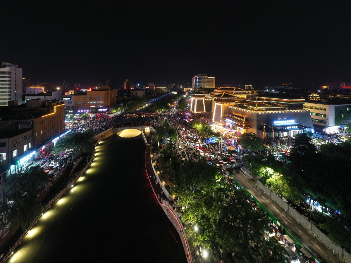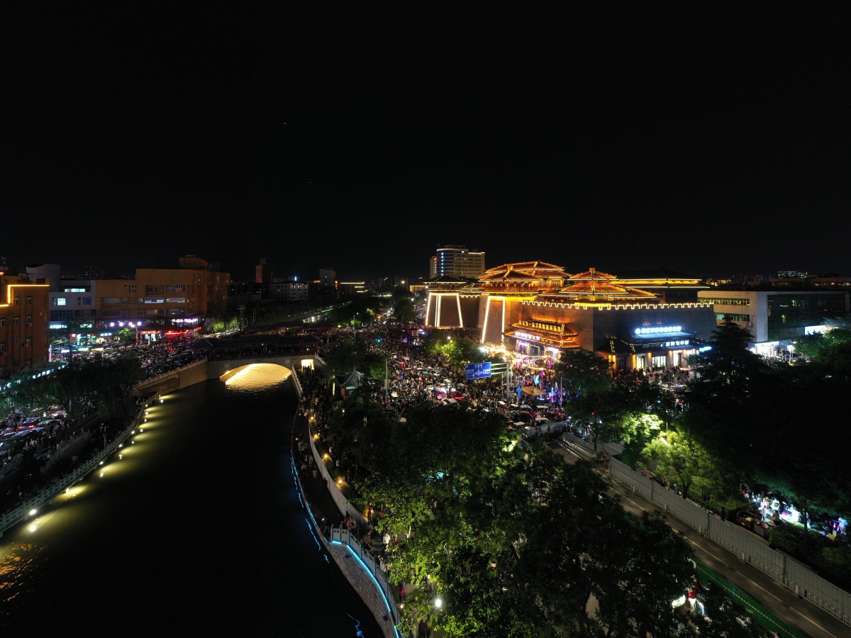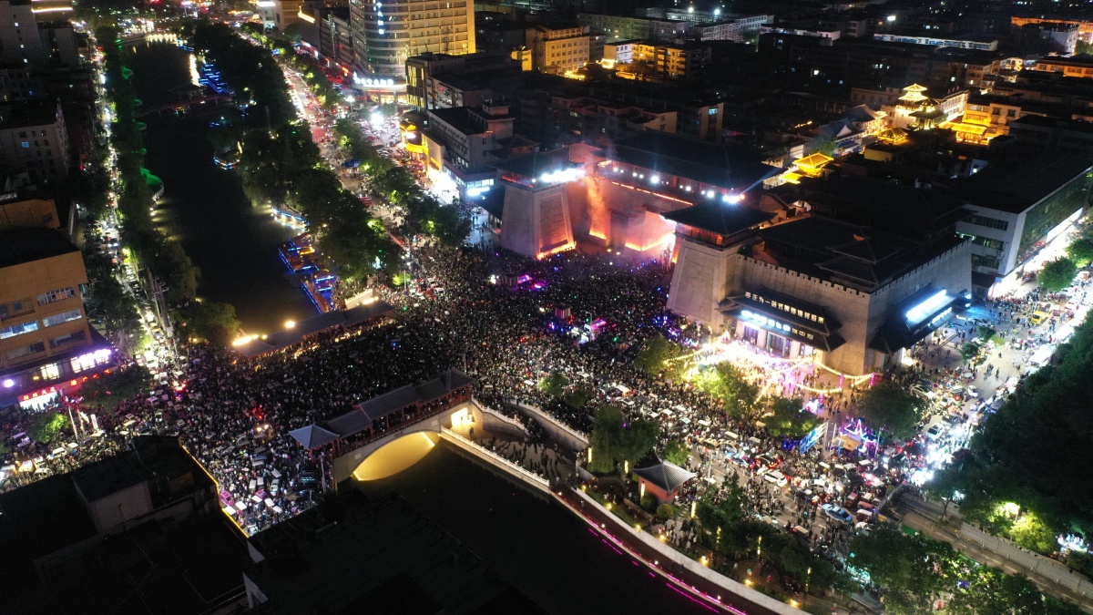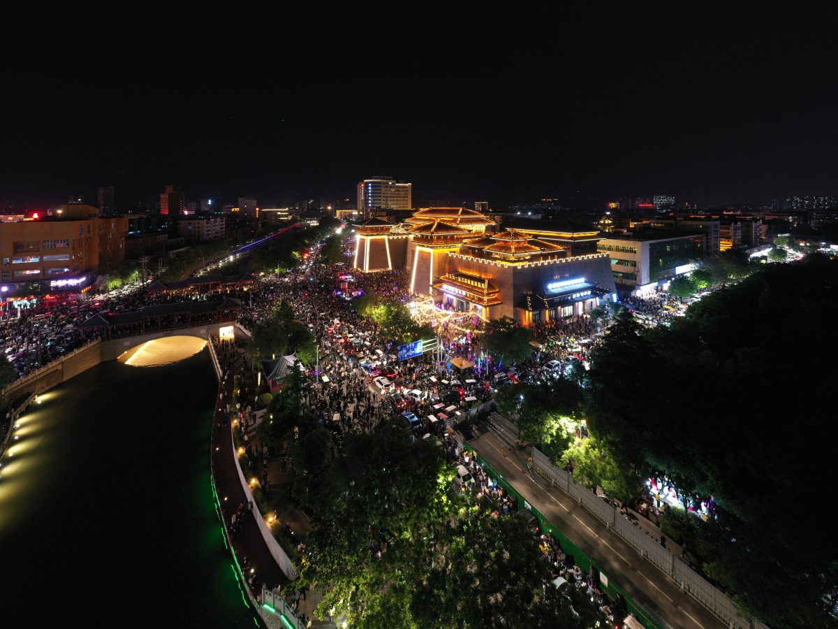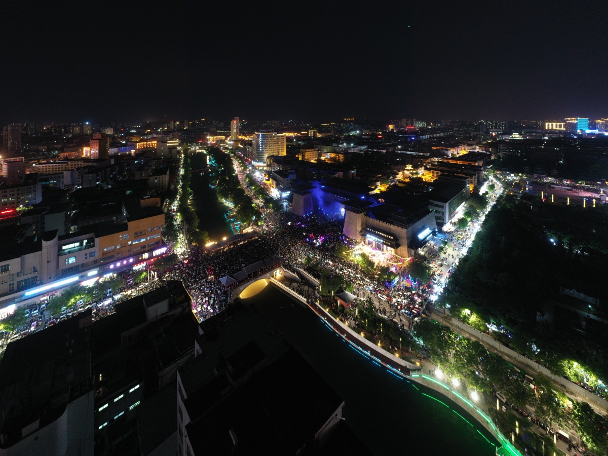 2023年5月7日,河南许昌,曹魏古城南灯光秀吸引众多市民前来观看。当晚,河南许昌曹魏古城南城门灯光秀限时返场,让古城的夜空流光溢彩,吸引众多市民前来观看。