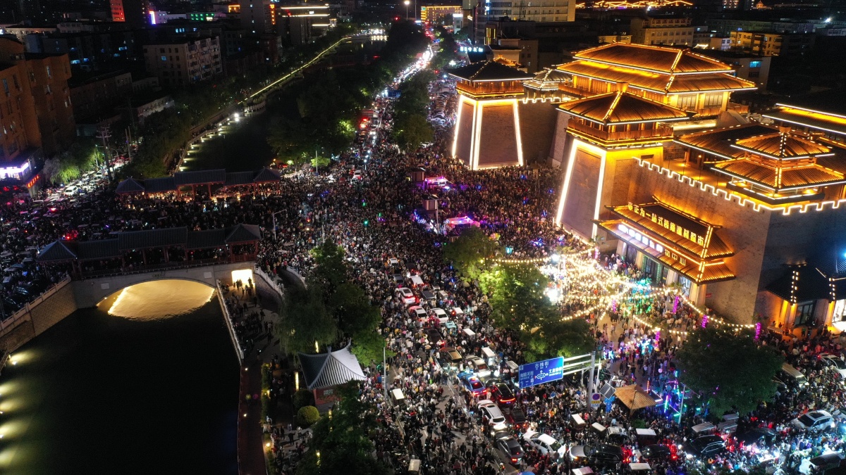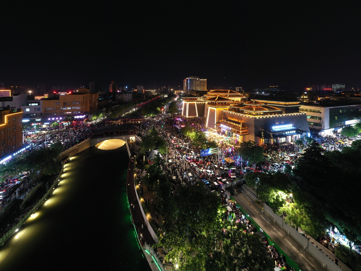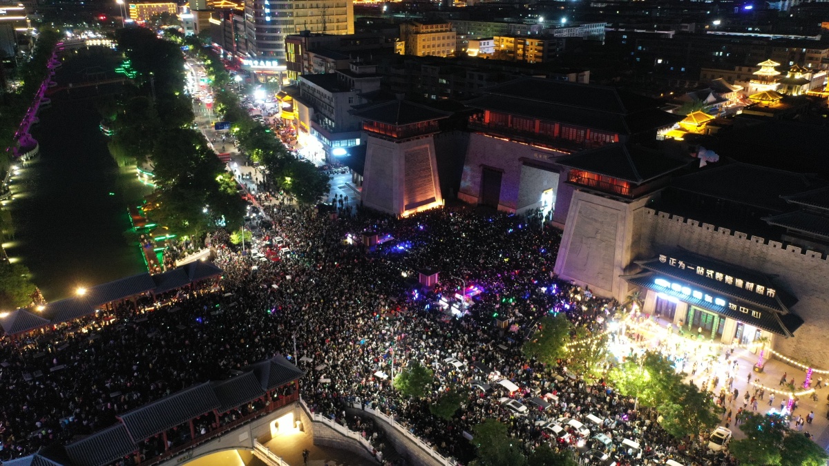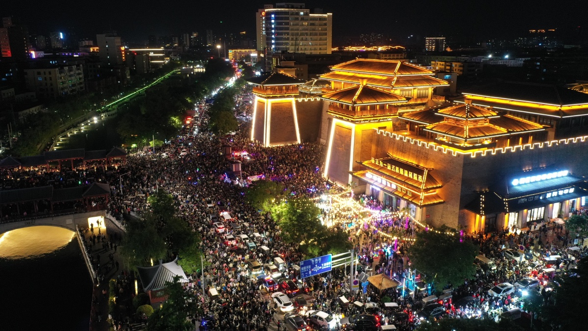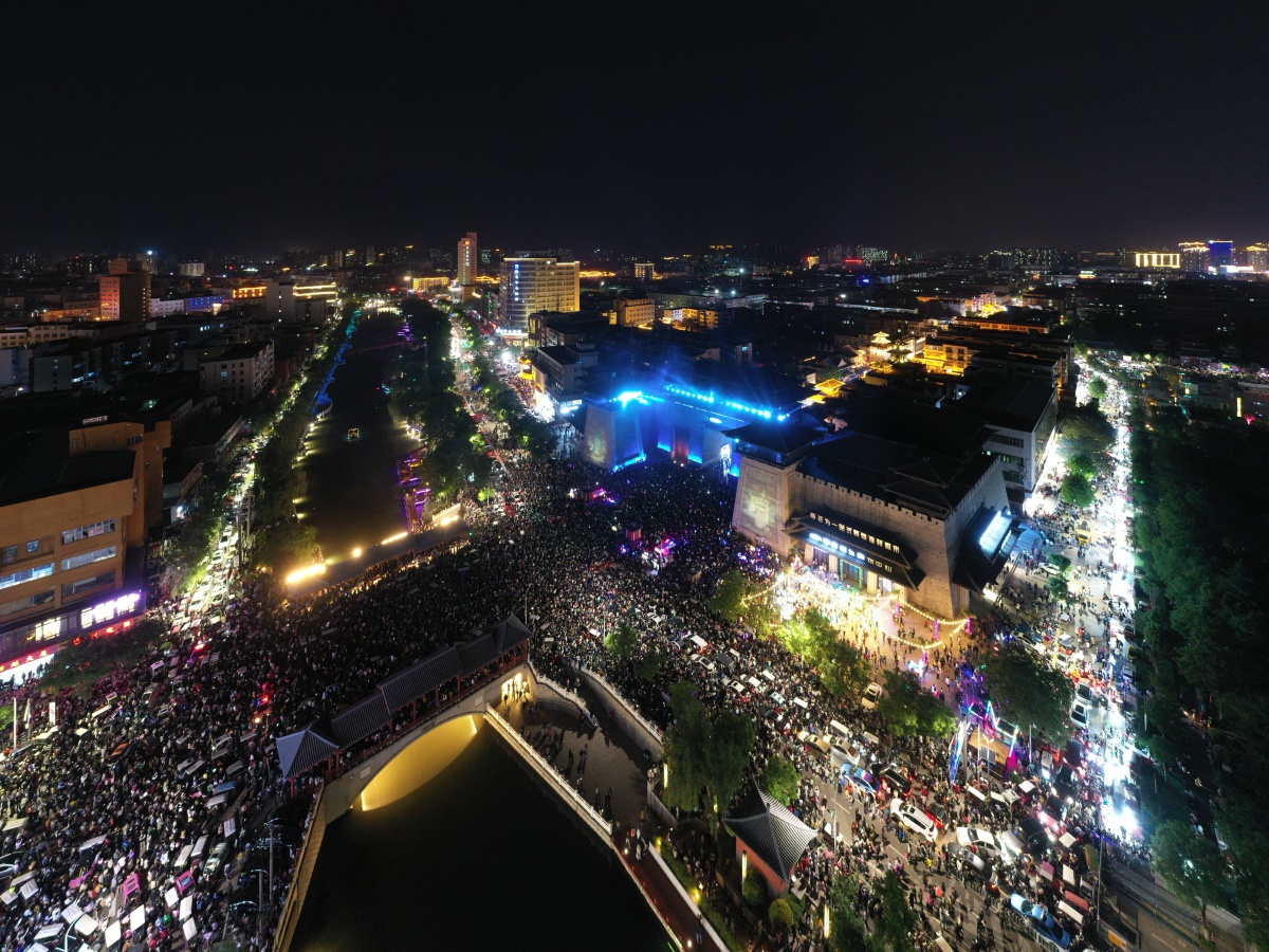 2023年5月7日,河南许昌,曹魏古城南灯光秀吸引众多市民前来观看。当晚,河南许昌曹魏古城南城门灯光秀限时返场,让古城的夜空流光溢彩,吸引众多市民前来观看。