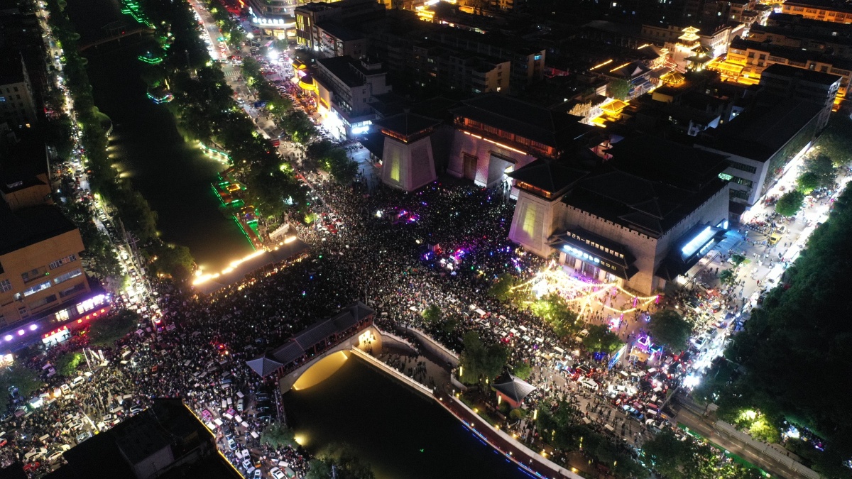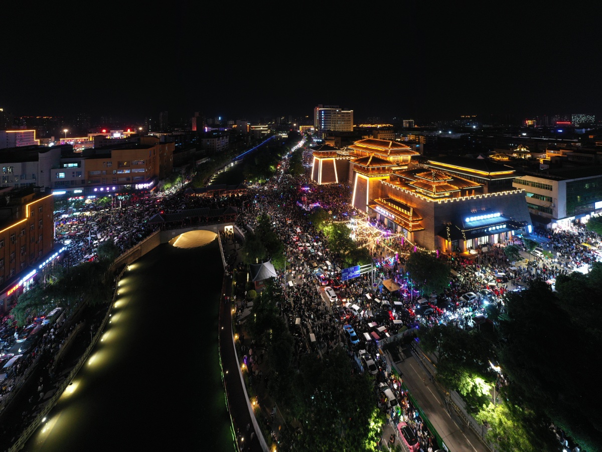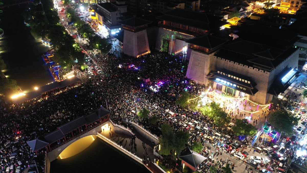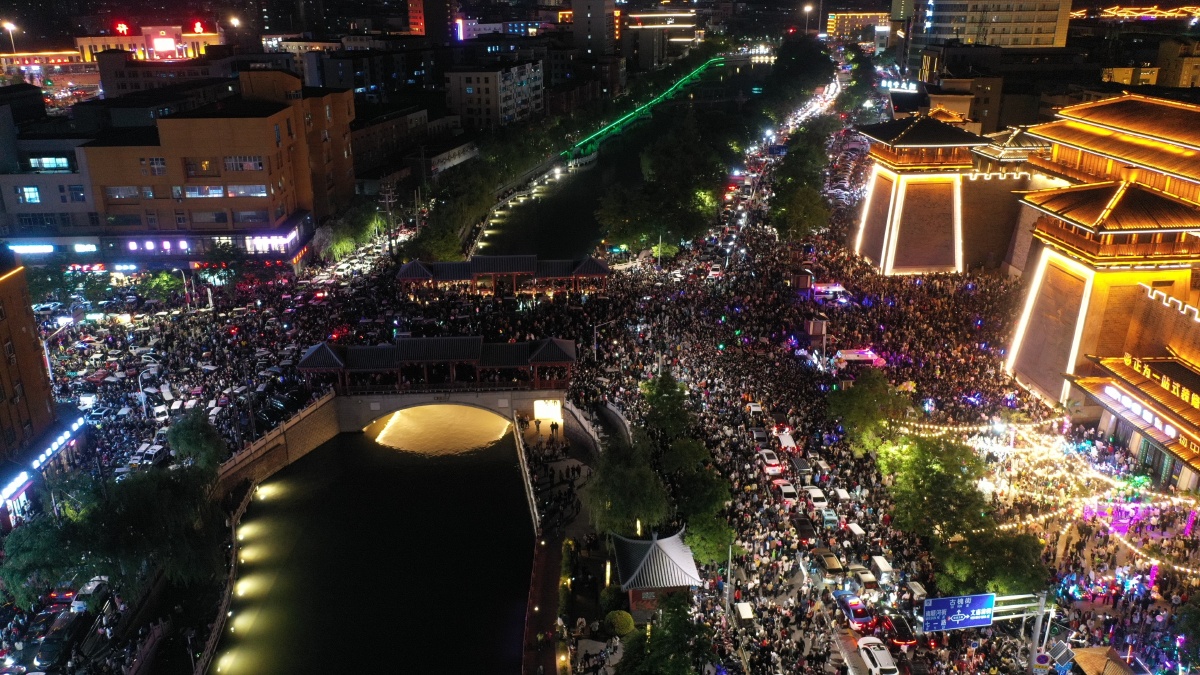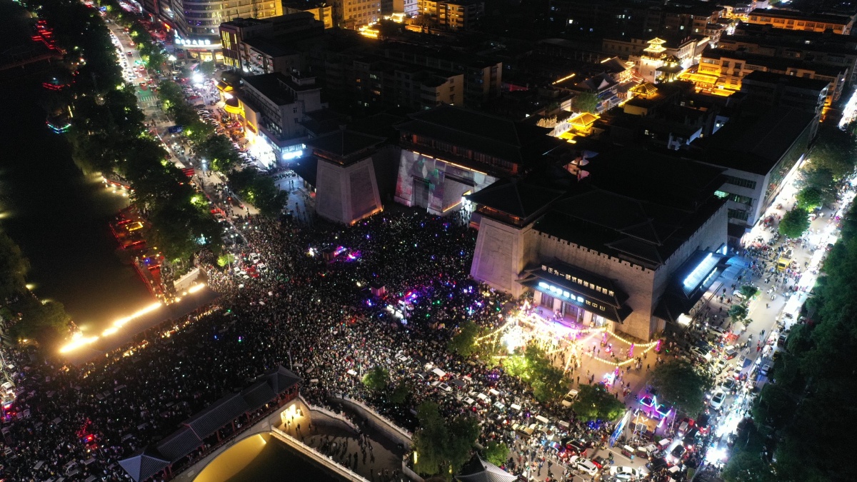 2023年5月7日,河南许昌,曹魏古城南灯光秀吸引众多市民前来观看。当晚,河南许昌曹魏古城南城门灯光秀限时返场,让古城的夜空流光溢彩,吸引众多市民前来观看。