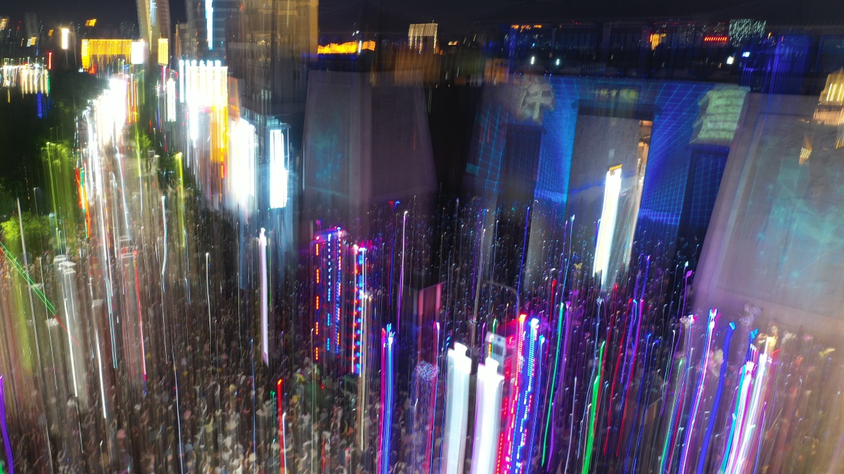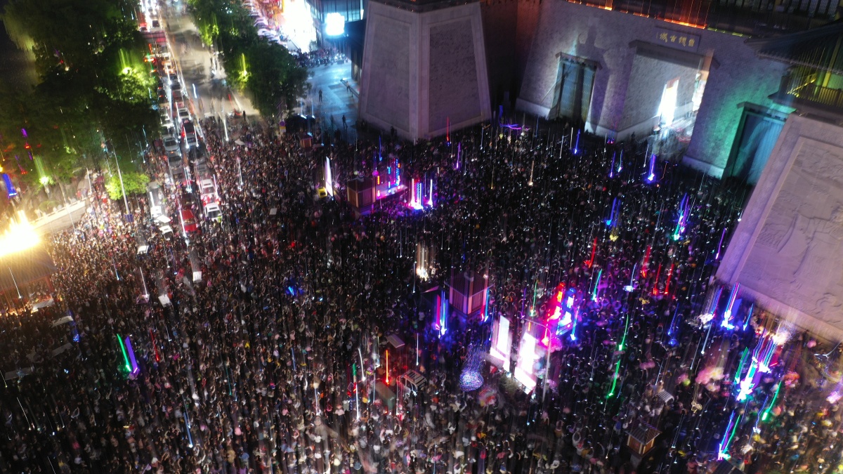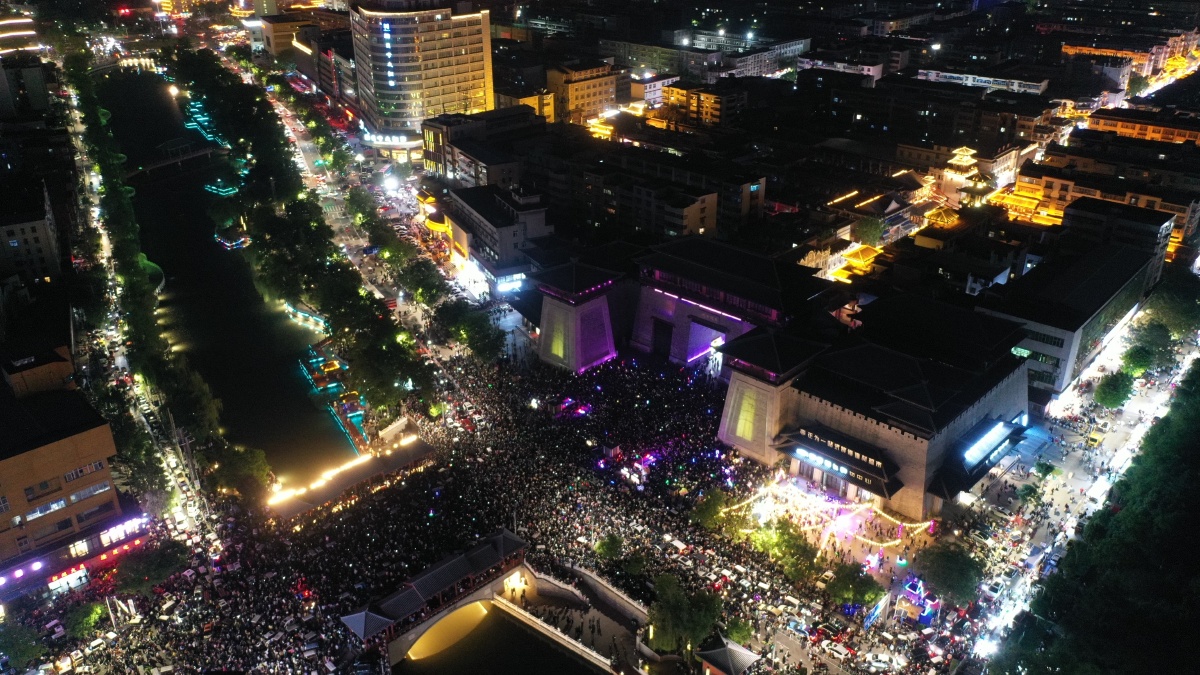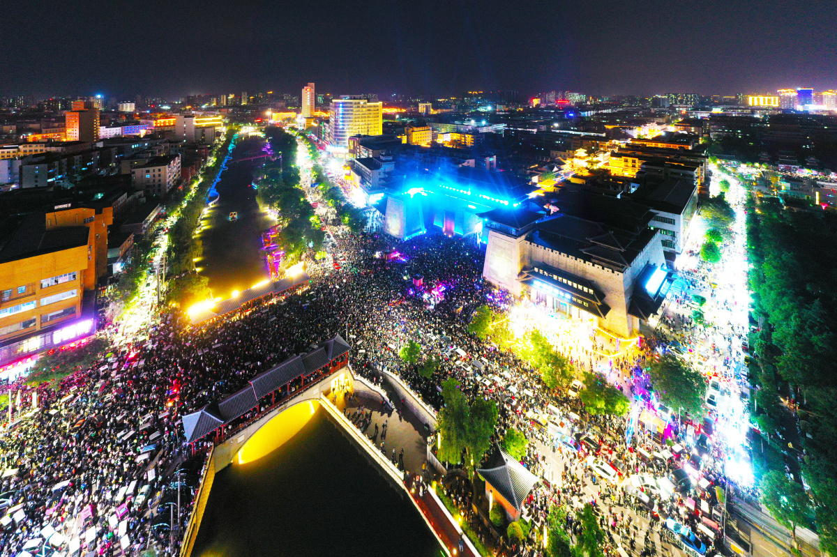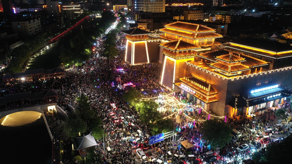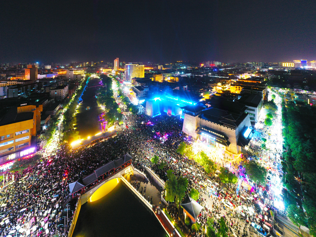 2023年5月7日,河南许昌,曹魏古城南灯光秀吸引众多市民前来观看。当晚,河南许昌曹魏古城南城门灯光秀限时返场,让古城的夜空流光溢彩,吸引众多市民前来观看。