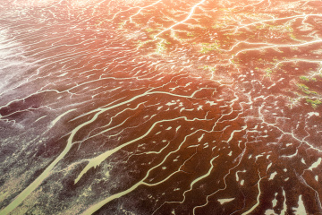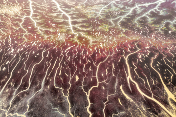 辽河入海口三角洲红海滩自然保护区,世界最大的红海滩湿地,三角洲四面环海,其中水网交错,数以万计的珍稀鸟类在湿地中繁衍生息,每年9-10月份是观赏红海滩的最佳季节,从空中俯瞰整个三角洲宛如一只巨大的燕尾蝶。