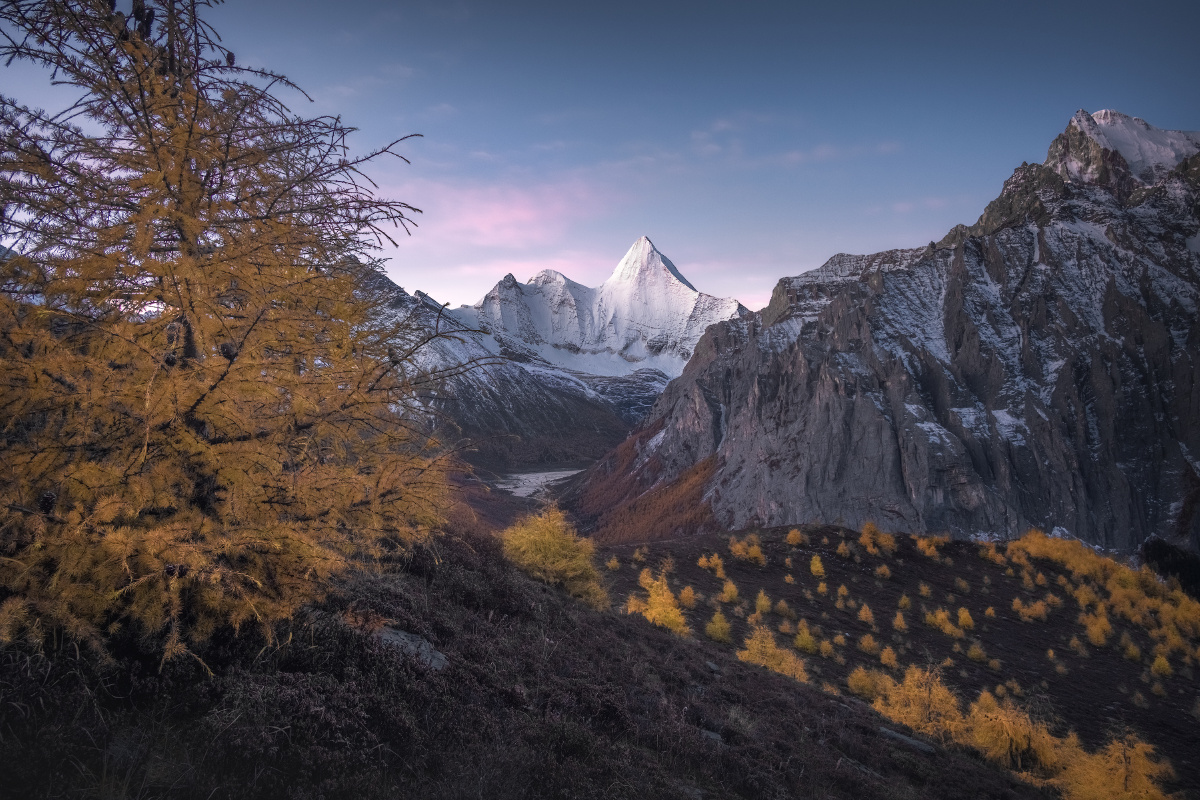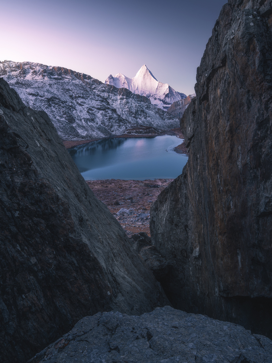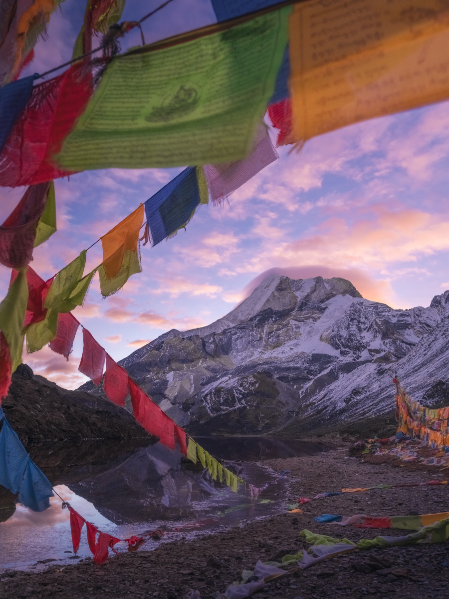 营地里,面对队员的询问,两个领队起了争执: 副领队:“3座山里,央迈勇6000多米,最高,其余两座都是5000多米”; 主领队:“不对,仙乃日6032米,央迈勇和夏诺多吉都是5958米,仙乃日最高”; 副领队:“最近数据已经改啦~”,他拖着长音说到; 主领队:“哎呀你这个不要和我争,肯定仙乃日最高嘛”,作为带队亚丁大转山无数次的资深领队,说话自然算数; 当时听到这段对话的我,自然认可主领队的观点: 1923年,探险家约瑟夫.洛克在木里王国的山顶上远眺,望见远处高耸入云的雪峰,了解到它们坐落在土匪出没的贡噶岭一带,当地土匪一边外出杀人越货,一边转山念经祈祷,令洛克大惑不解,也令他痴迷于那三座傲然的雪峰。之后他终于在1928年经由木里土司的保护,梦想成真地进入贡噶岭地区,去详细考察“念青贡嘎日松贡布”——即我们所称的亚丁三怙主神山:金刚手菩萨夏诺多吉,文殊菩萨央迈勇,观世音菩萨仙乃日,并通过生动有趣的考察报告将它们的威名远播世界; 然后新中国90年代后,在条件尚十分艰苦、横断山区尚十分闭塞之时,经由吕玲珑等摄影家“筚路蓝缕,以启山林”似的推广和介绍,亚丁三神山开始在中国户外圈和摄影圈小有名气;“美国顶级登山家尝试攀登央迈勇,在5000多米海拔判断自己有可能登顶,但之后无法在陡峭岩壁上扎营,且99%的可能死于下撤途中”的传说更是在专业登山界为三怙主雪山增添了传奇; 直至近年,院线电影《从你的全世界路过》终于将其推至火爆的最前台,稻城亚丁景区作为“最后的香格里拉”开始成为四川乃至全国最牛的旅行目的地之一, 一系列的历史发展之后,“仙乃日6032、央迈勇和夏诺多吉5958”的数据就被对雪山感兴趣的爱好者所铭记,像是颠扑不破的真理。 可是,我和主领队都错了。 就在我们在没有信号、几乎与世隔绝的大山中蹒跚而行时,我国最新的测绘数据已经出炉,依据最新的数据,央迈勇以海拔6033米的高度一跃成为三怙主神山之首,仙乃日以海拔5998米位居第二,夏诺多吉海拔5951米屈居第三。自这一刻起,虽然它们已经挺立亿万年的身躯没有一丝一毫的改变,但他们似乎都拥有了一个新的灵魂。作为神格最高的、代表智慧的文殊菩萨的央迈勇,终于有了和他的灵性相称的最高的身高;神格第二的慈悲的观世音菩萨仙乃日位居第二;神格第三的刚猛的金刚手菩萨夏诺多吉位居第三——一切都是那么完美,如同佛法特意的安排。 拍摄于2023年10月。