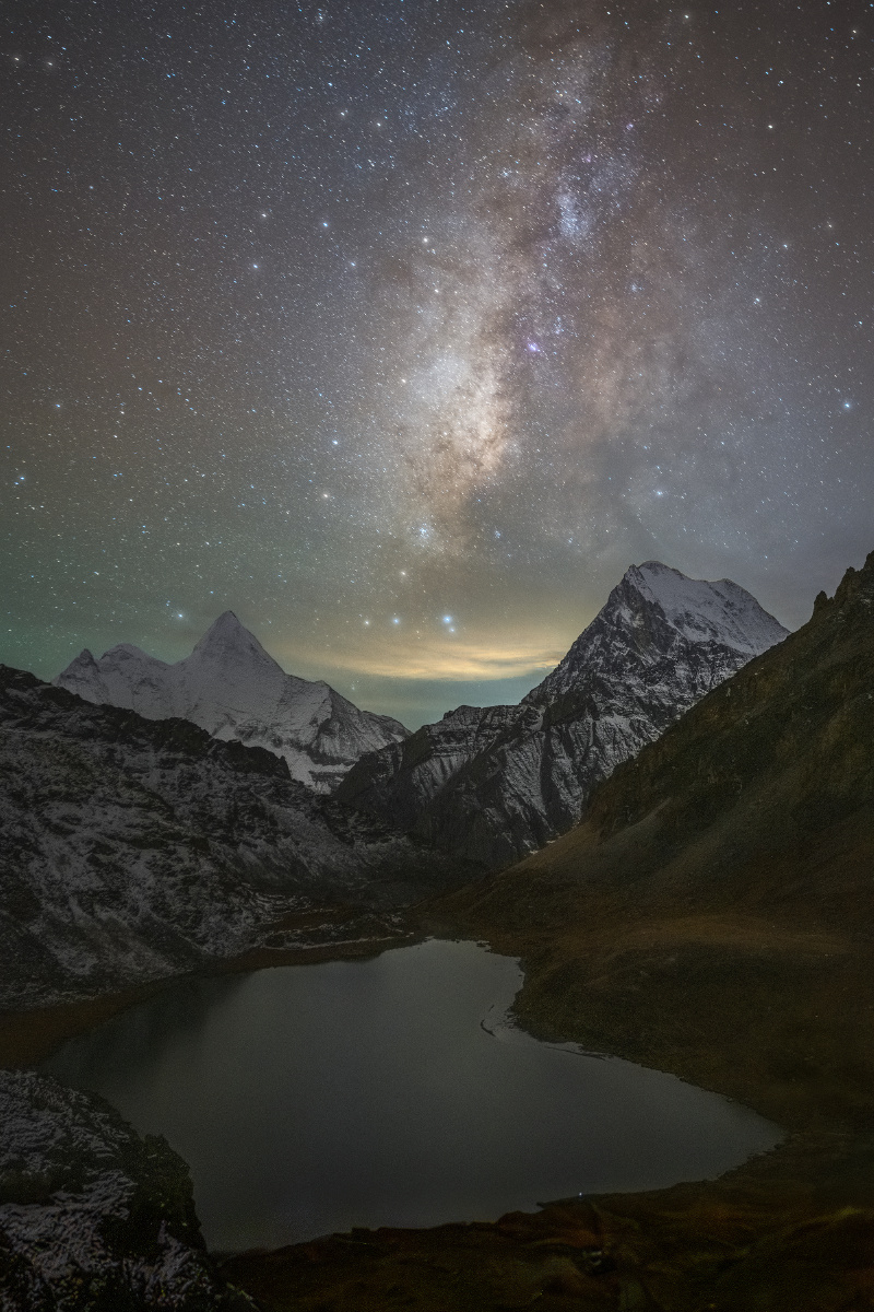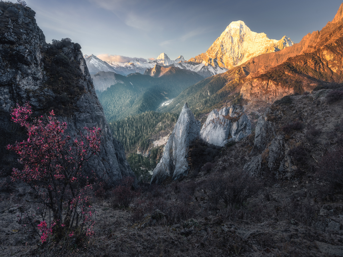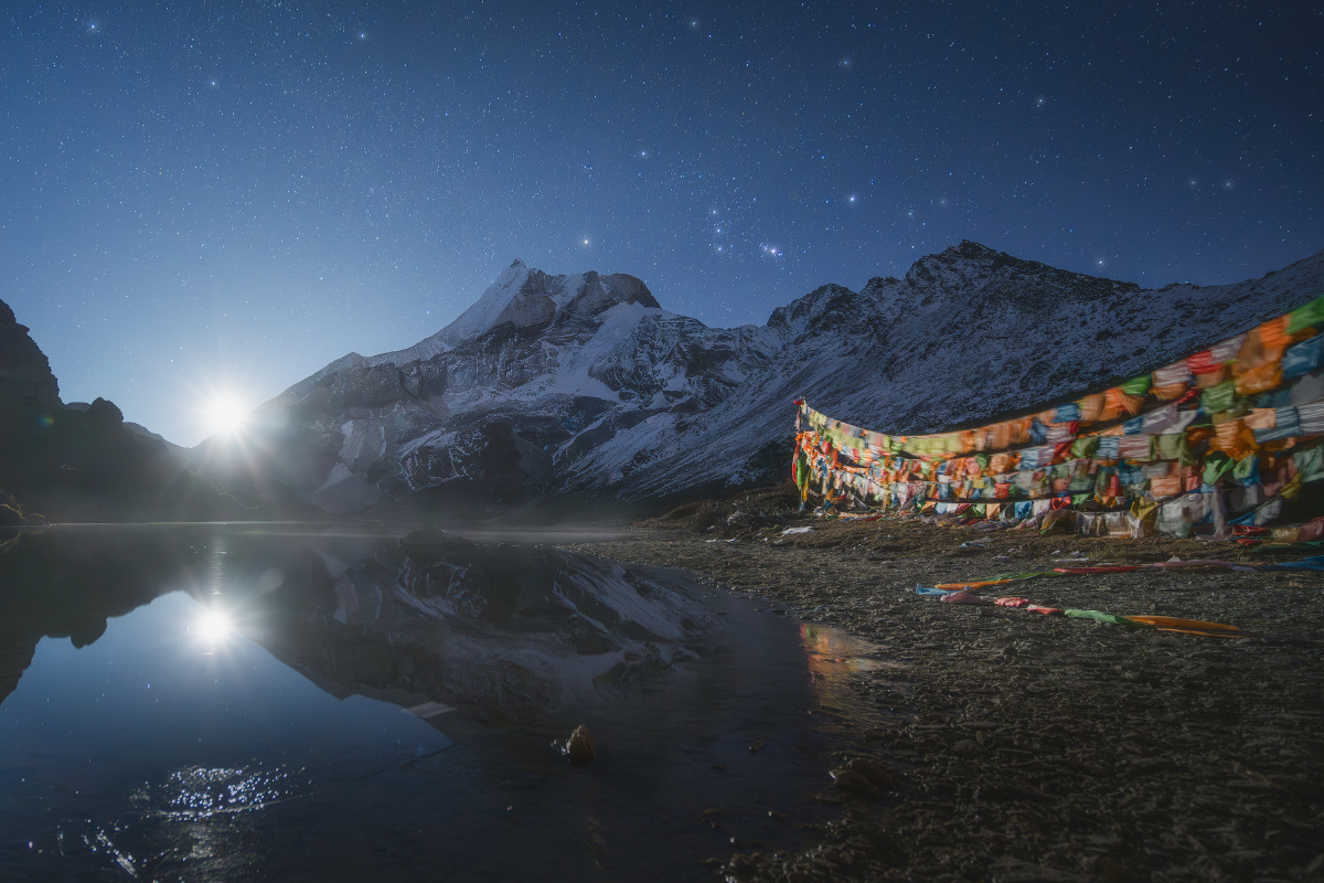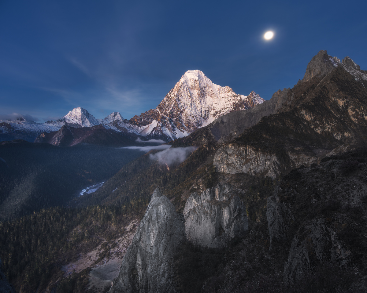 营地里,面对队员的询问,两个领队起了争执: 副领队:“3座山里,央迈勇6000多米,最高,其余两座都是5000多米”; 主领队:“不对,仙乃日6032米,央迈勇和夏诺多吉都是5958米,仙乃日最高”; 副领队:“最近数据已经改啦~”,他拖着长音说到; 主领队:“哎呀你这个不要和我争,肯定仙乃日最高嘛”,作为带队亚丁大转山无数次的资深领队,说话自然算数; 当时听到这段对话的我,自然认可主领队的观点: 1923年,探险家约瑟夫.洛克在木里王国的山顶上远眺,望见远处高耸入云的雪峰,了解到它们坐落在土匪出没的贡噶岭一带,当地土匪一边外出杀人越货,一边转山念经祈祷,令洛克大惑不解,也令他痴迷于那三座傲然的雪峰。之后他终于在1928年经由木里土司的保护,梦想成真地进入贡噶岭地区,去详细考察“念青贡嘎日松贡布”——即我们所称的亚丁三怙主神山:金刚手菩萨夏诺多吉,文殊菩萨央迈勇,观世音菩萨仙乃日,并通过生动有趣的考察报告将它们的威名远播世界; 然后新中国90年代后,在条件尚十分艰苦、横断山区尚十分闭塞之时,经由吕玲珑等摄影家“筚路蓝缕,以启山林”似的推广和介绍,亚丁三神山开始在中国户外圈和摄影圈小有名气;“美国顶级登山家尝试攀登央迈勇,在5000多米海拔判断自己有可能登顶,但之后无法在陡峭岩壁上扎营,且99%的可能死于下撤途中”的传说更是在专业登山界为三怙主雪山增添了传奇; 直至近年,院线电影《从你的全世界路过》终于将其推至火爆的最前台,稻城亚丁景区作为“最后的香格里拉”开始成为四川乃至全国最牛的旅行目的地之一, 一系列的历史发展之后,“仙乃日6032、央迈勇和夏诺多吉5958”的数据就被对雪山感兴趣的爱好者所铭记,像是颠扑不破的真理。 可是,我和主领队都错了。 就在我们在没有信号、几乎与世隔绝的大山中蹒跚而行时,我国最新的测绘数据已经出炉,依据最新的数据,央迈勇以海拔6033米的高度一跃成为三怙主神山之首,仙乃日以海拔5998米位居第二,夏诺多吉海拔5951米屈居第三。自这一刻起,虽然它们已经挺立亿万年的身躯没有一丝一毫的改变,但他们似乎都拥有了一个新的灵魂。作为神格最高的、代表智慧的文殊菩萨的央迈勇,终于有了和他的灵性相称的最高的身高;神格第二的慈悲的观世音菩萨仙乃日位居第二;神格第三的刚猛的金刚手菩萨夏诺多吉位居第三——一切都是那么完美,如同佛法特意的安排。 拍摄于2023年10月。