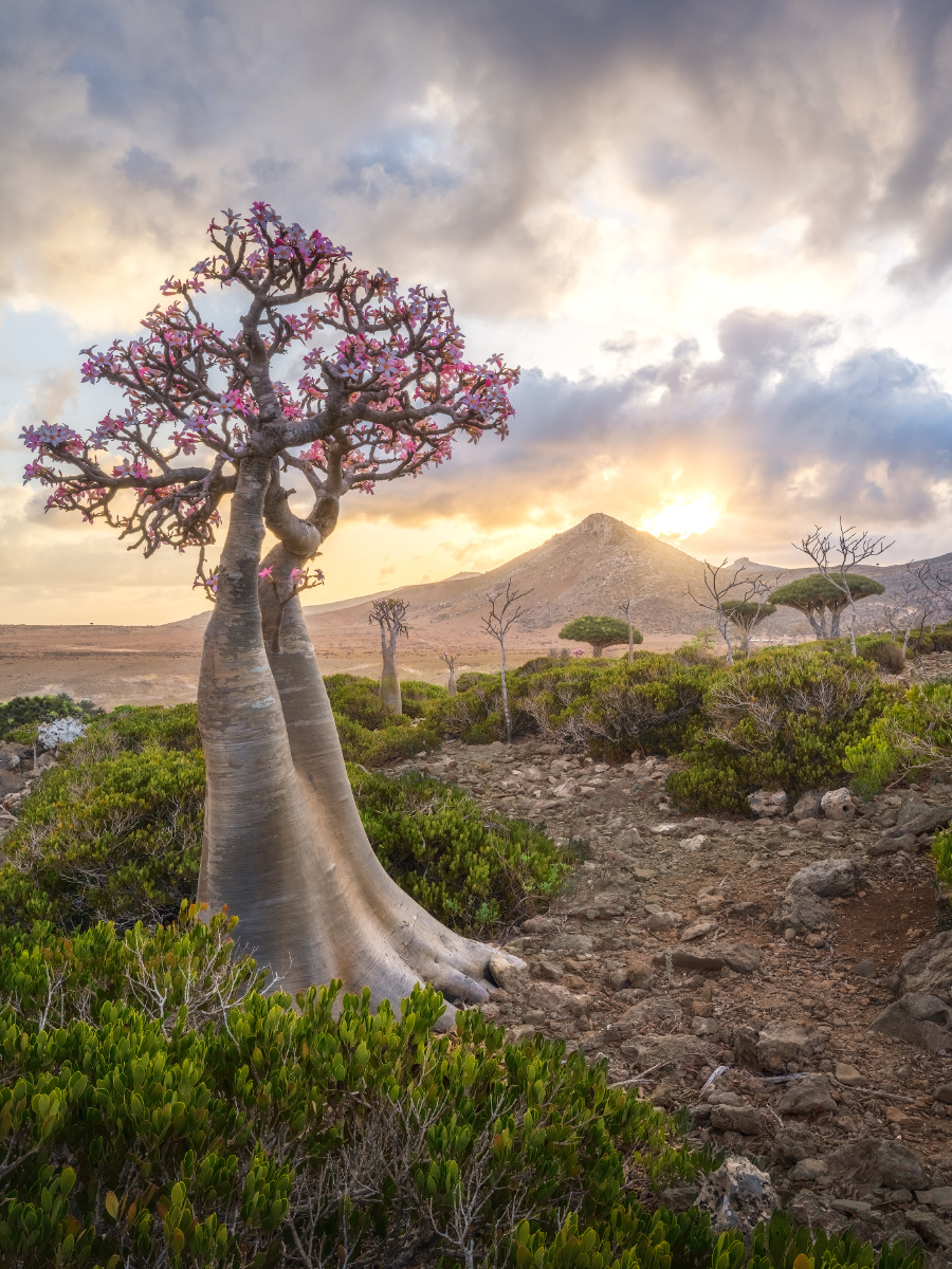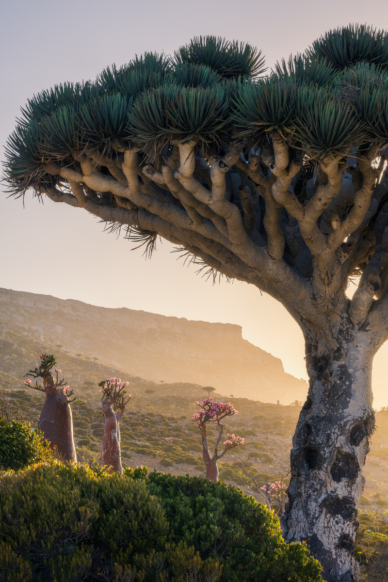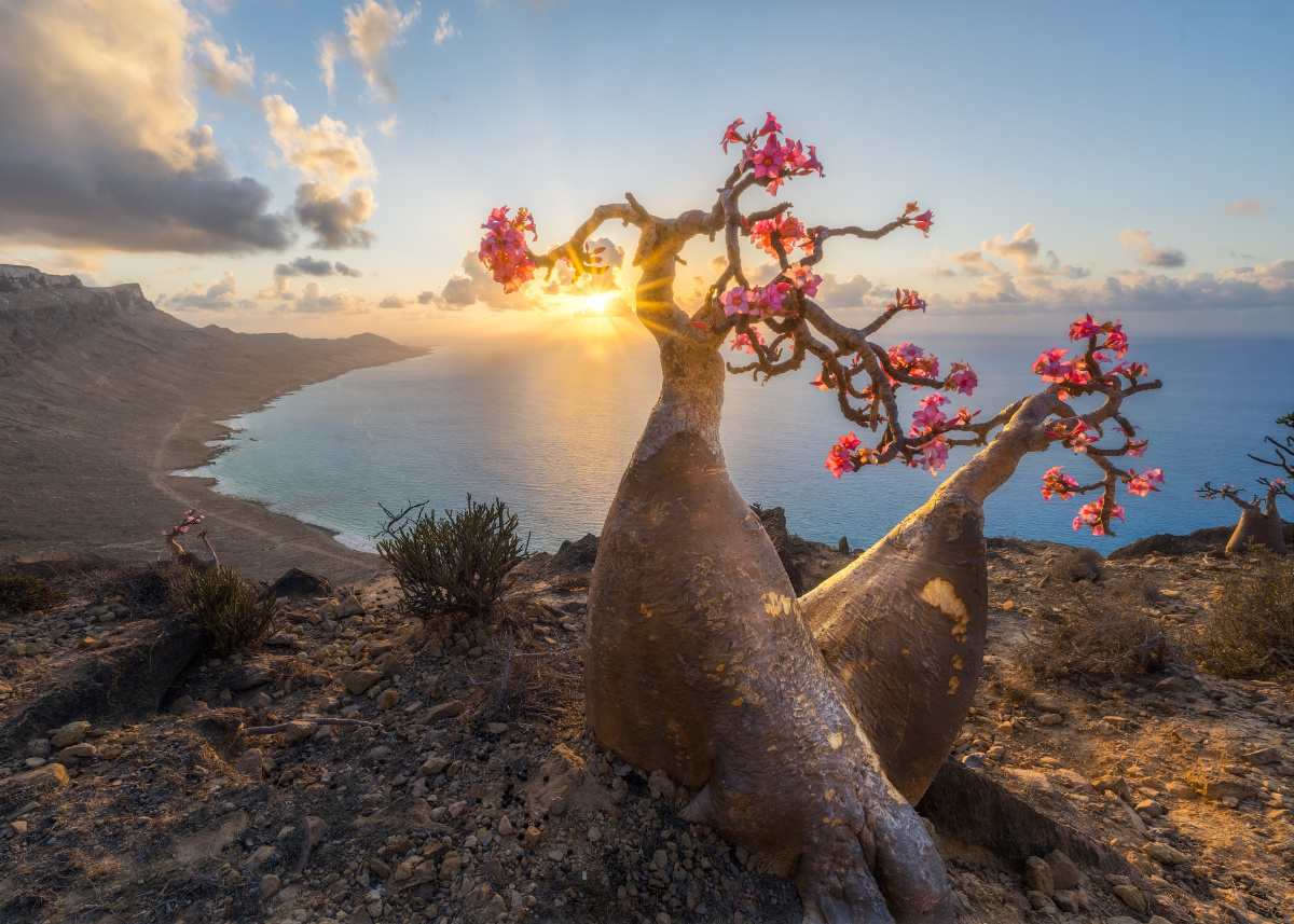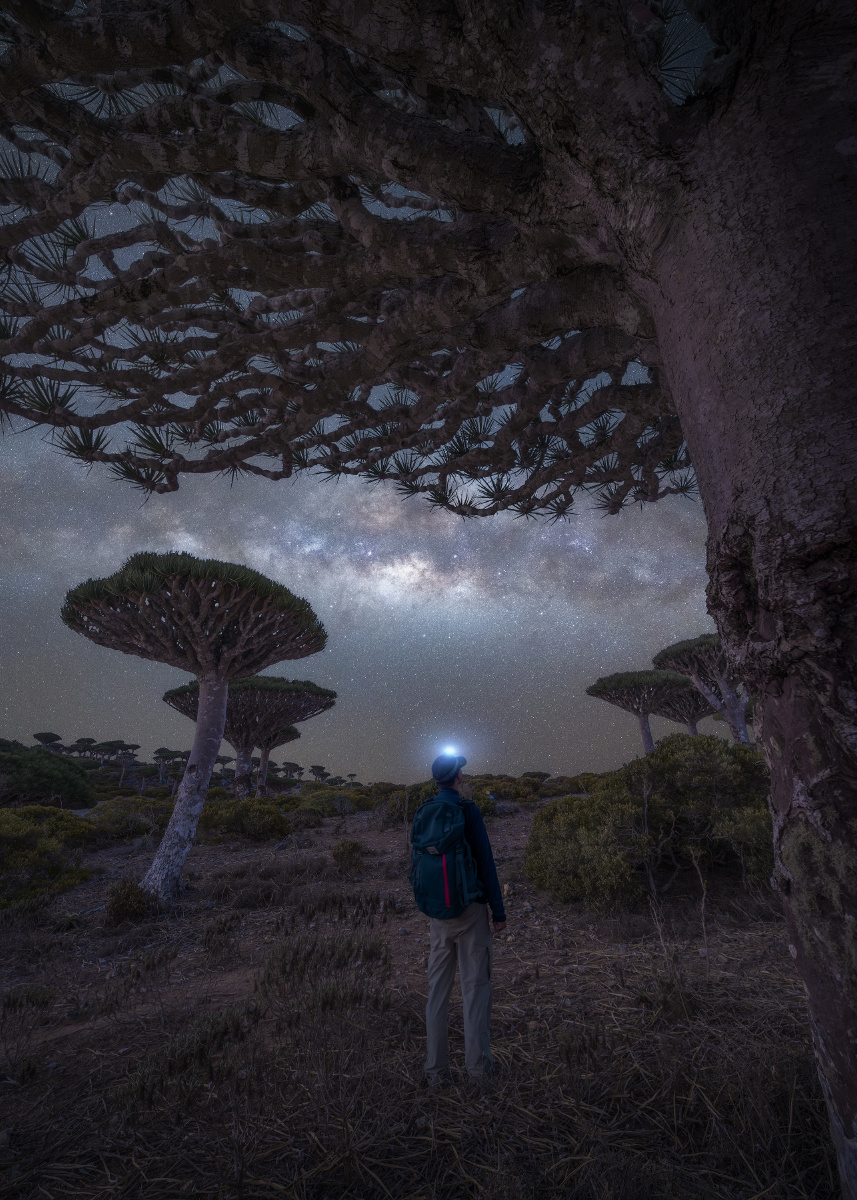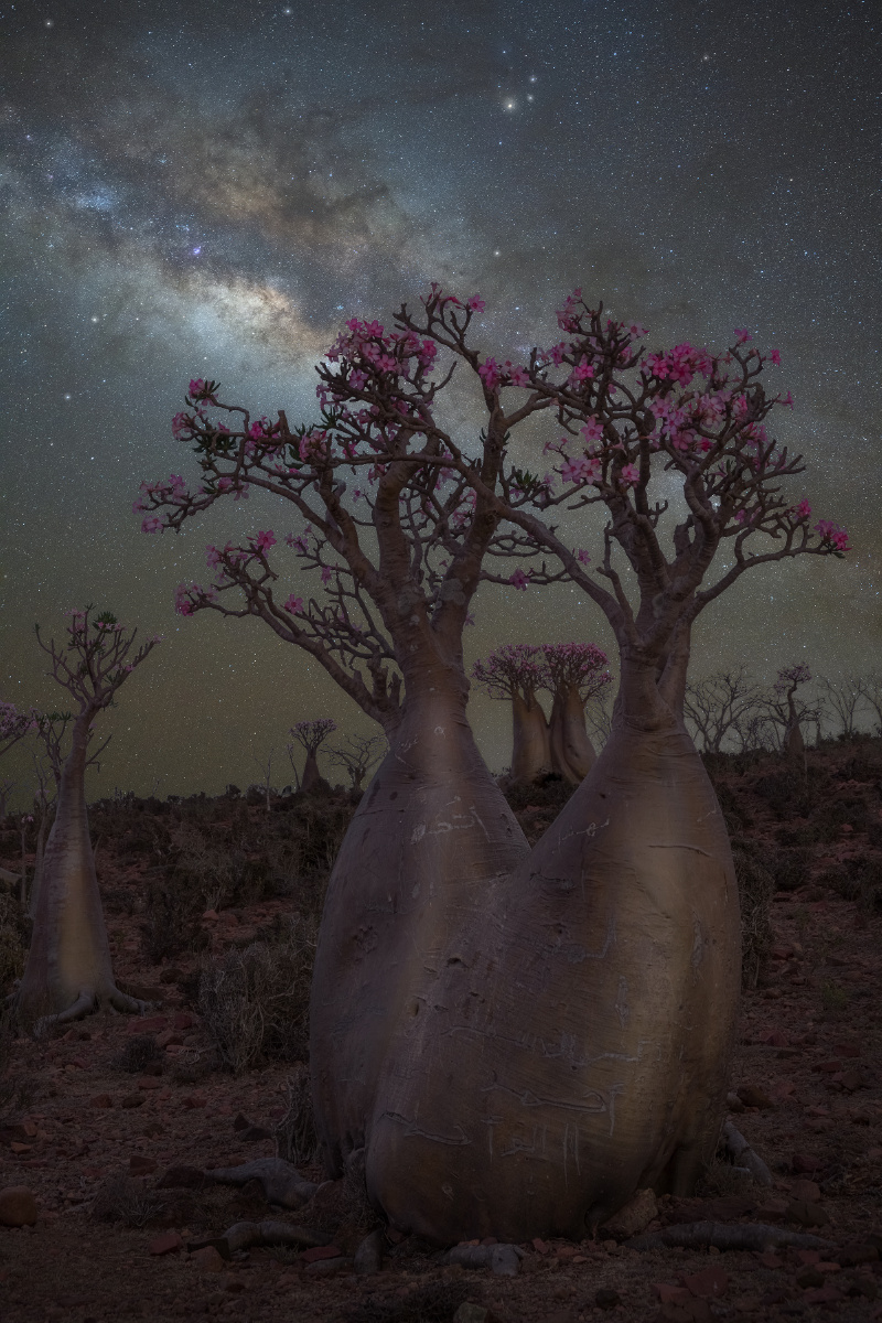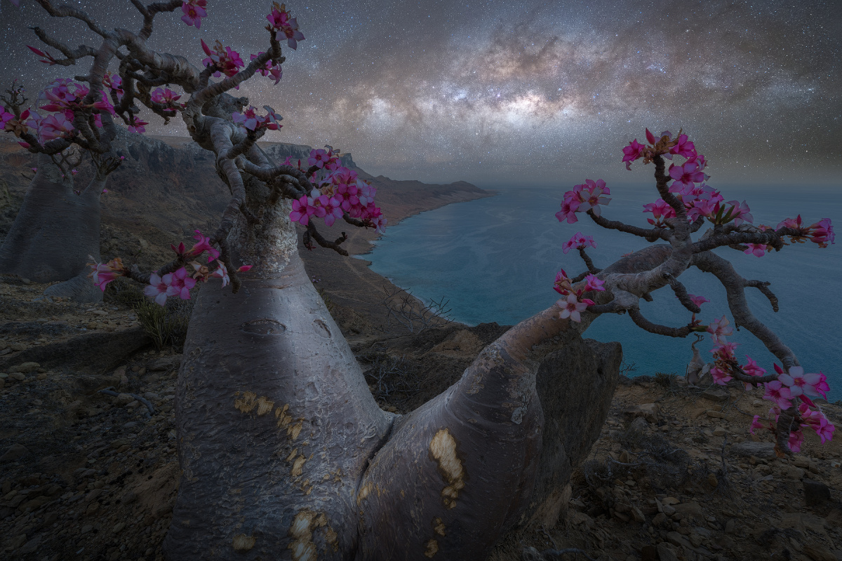 今年3月底4月初,我在神秘的也门(Yemen)索科特拉岛(Socotra Island)最美的花季中拍摄了8天,如同来到了塞尔达或异星的世界。 索科特拉岛位于阿拉伯海和亚丁湾的交界处,1800万年前从冈瓦纳古大陆上分离,从此开始它孤独的漂移。 和身侧的非洲大陆和环绕的印度洋比起来,这个小岛是那么渺小,像地球掉落的微不足道的碎屑。 它距离西边的索马里250公里,距离北边的也门340公里,孤悬于大洋之中,可谓与世隔绝。 岛屿长132公里宽50公里的土地上飞沙走石,烈日四季炙烤; 每年5个月的漫长风季中,狂风甚至让当地人无法迈出家门一步,船只无法靠岸,飞机无法降落,如同炼狱一般。 但另一方面,沿岸细腻的沙滩镶嵌着蓝得惊心动魄的大海,渔民在沙滩边都能捕到鱼儿,惬意地好似最初的伊甸; 高原上的森林里夜间会泛起海雾,甘甜的露水充盈在空气中,闪烁着璀璨的星光。 索科特拉岛的标志是龙血树和沙漠玫瑰,两种有着史前气质的巨型植物,如果从它们身后窜出一只迅猛龙或始祖鸟的话我不会感到惊讶。 首先,它们的寿命都有着惊人的尺度。在岛上的培育园里, 4年的龙血树只像个放在办公桌上的小盆栽,26年的龙血树也只不过是放在地上的盆景, 岛上漫山遍野4米高的野生龙血树需要生长2000年。沙漠玫瑰长到1米高也需要200年。 其次是它们奇特的外观。龙血树巨大的树冠像是一个外星飞碟,而树冠下盘根错节的树枝则像飞碟裸露在外的管道。 如果说龙血树长得还算基本相似的话,那么沙漠玫瑰就千奇百怪了,我怀疑岛上没有两株沙漠玫瑰是长得一模一样的。 “沙漠玫瑰”这个浪漫唯美的名字其实和它的外形不太相称,它们像被晒伤的臃肿的大胖子, 或拙劣的工匠制作失误的陶罐, 个个都歪瓜裂枣,滑稽可笑,唯有3~4月花季时头顶上盛开的粉色花朵让人觉得可爱和悦目。 更准确地说,索科特拉岛2008年被联合国教科文组织列入世界自然遗产, 原因就在于岛上生存的700多种动植物中,有大约1/3是世界上的其他地方所完全没有的。 千万年的独立演化,已使其接近于外星的独特。 而当比岛屿更古老亿万倍的星光照耀到这片砾石土地上时, 当银河在龙血树和沙漠玫瑰的树杈间穿梭和舞动, 我漫步其中,感觉自己成了一名迷失航向的宇航员,被丢弃在了陌生的外星球。 脚下踏着的坚实大地也不过是一粒宇宙间最微不足道的尘埃, 但却是一粒美得最惊心动魄、最让人感官得到满足的尘埃。