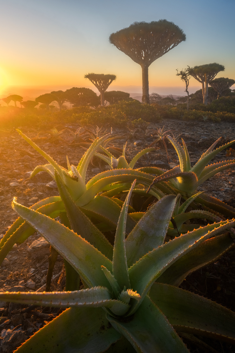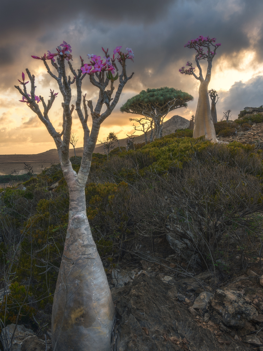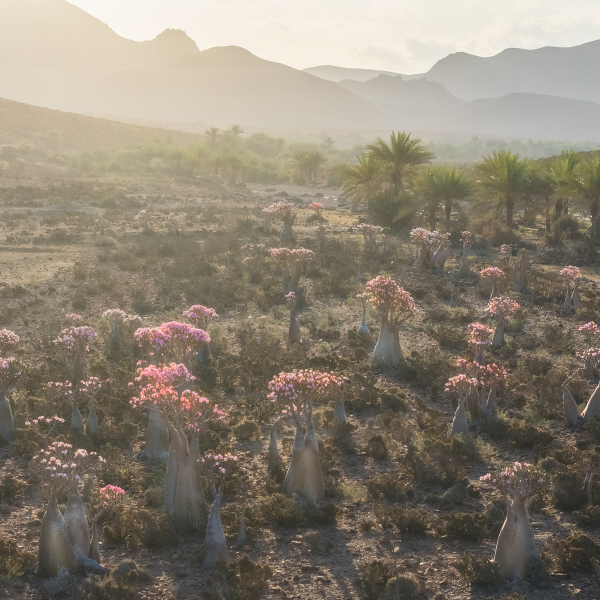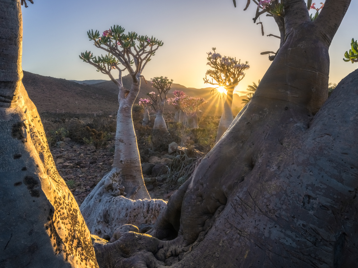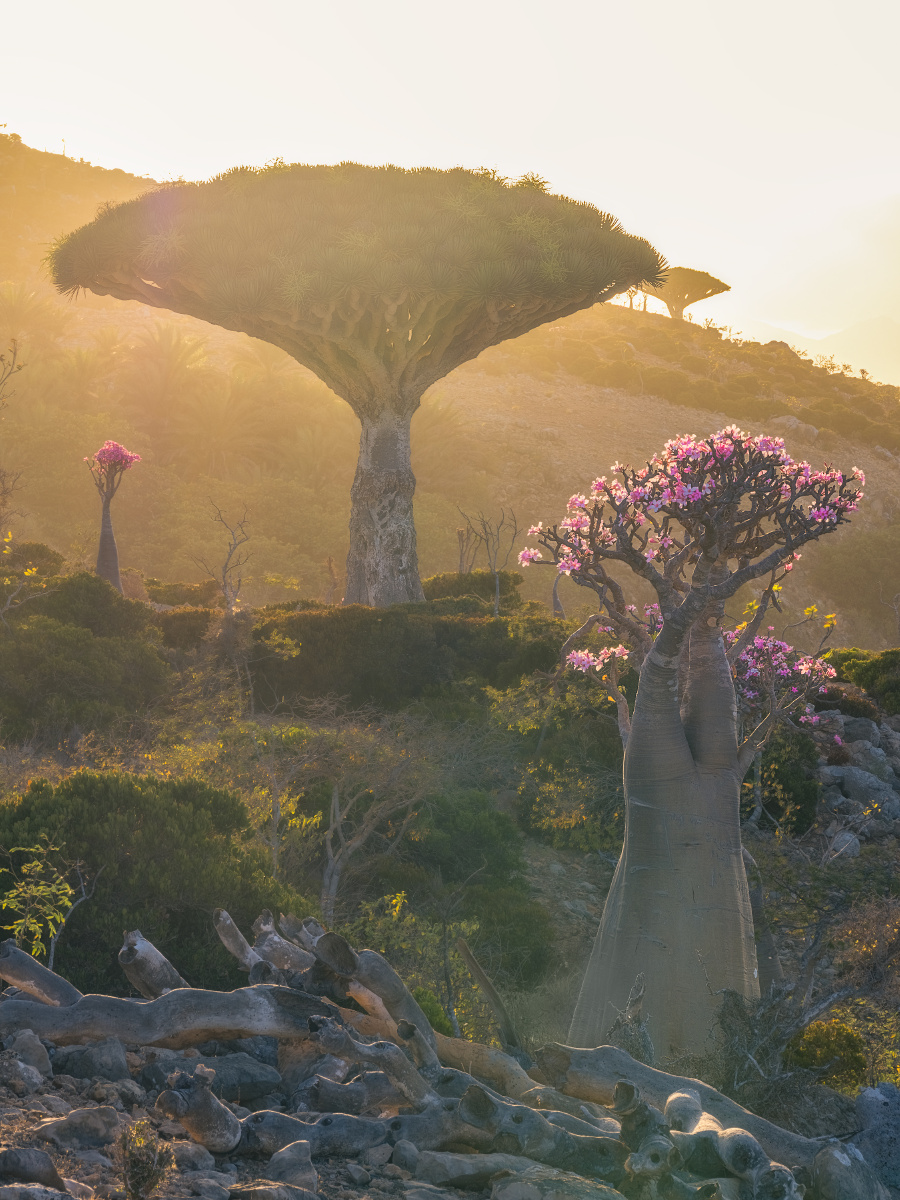 今年3月底4月初,我在神秘的也门(Yemen)索科特拉岛(Socotra Island)最美的花季中拍摄了8天,如同来到了塞尔达或异星的世界。 索科特拉岛位于阿拉伯海和亚丁湾的交界处,1800万年前从冈瓦纳古大陆上分离,从此开始它孤独的漂移。 和身侧的非洲大陆和环绕的印度洋比起来,这个小岛是那么渺小,像地球掉落的微不足道的碎屑。 它距离西边的索马里250公里,距离北边的也门340公里,孤悬于大洋之中,可谓与世隔绝。 岛屿长132公里宽50公里的土地上飞沙走石,烈日四季炙烤; 每年5个月的漫长风季中,狂风甚至让当地人无法迈出家门一步,船只无法靠岸,飞机无法降落,如同炼狱一般。 但另一方面,沿岸细腻的沙滩镶嵌着蓝得惊心动魄的大海,渔民在沙滩边都能捕到鱼儿,惬意地好似最初的伊甸; 高原上的森林里夜间会泛起海雾,甘甜的露水充盈在空气中,闪烁着璀璨的星光。 索科特拉岛的标志是龙血树和沙漠玫瑰,两种有着史前气质的巨型植物,如果从它们身后窜出一只迅猛龙或始祖鸟的话我不会感到惊讶。 首先,它们的寿命都有着惊人的尺度。在岛上的培育园里, 4年的龙血树只像个放在办公桌上的小盆栽,26年的龙血树也只不过是放在地上的盆景, 岛上漫山遍野4米高的野生龙血树需要生长2000年。沙漠玫瑰长到1米高也需要200年。 其次是它们奇特的外观。龙血树巨大的树冠像是一个外星飞碟,而树冠下盘根错节的树枝则像飞碟裸露在外的管道。 如果说龙血树长得还算基本相似的话,那么沙漠玫瑰就千奇百怪了,我怀疑岛上没有两株沙漠玫瑰是长得一模一样的。 “沙漠玫瑰”这个浪漫唯美的名字其实和它的外形不太相称,它们像被晒伤的臃肿的大胖子, 或拙劣的工匠制作失误的陶罐, 个个都歪瓜裂枣,滑稽可笑,唯有3~4月花季时头顶上盛开的粉色花朵让人觉得可爱和悦目。 更准确地说,索科特拉岛2008年被联合国教科文组织列入世界自然遗产, 原因就在于岛上生存的700多种动植物中,有大约1/3是世界上的其他地方所完全没有的。 千万年的独立演化,已使其接近于外星的独特。 而当比岛屿更古老亿万倍的星光照耀到这片砾石土地上时, 当银河在龙血树和沙漠玫瑰的树杈间穿梭和舞动, 我漫步其中,感觉自己成了一名迷失航向的宇航员,被丢弃在了陌生的外星球。 脚下踏着的坚实大地也不过是一粒宇宙间最微不足道的尘埃, 但却是一粒美得最惊心动魄、最让人感官得到满足的尘埃。