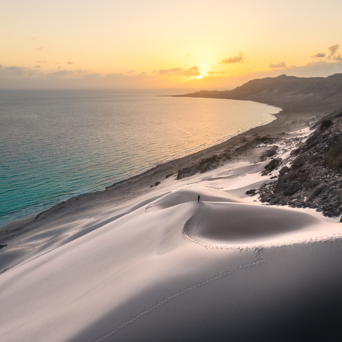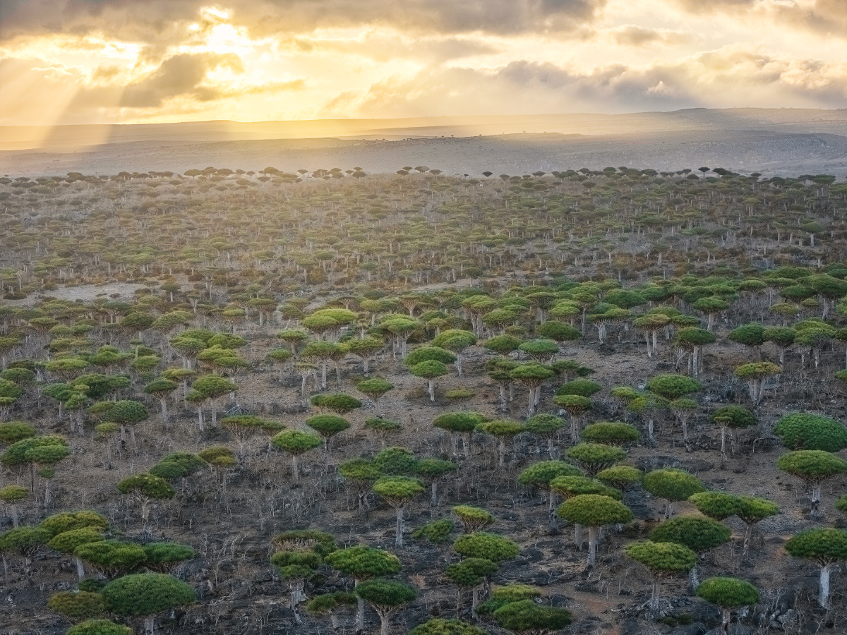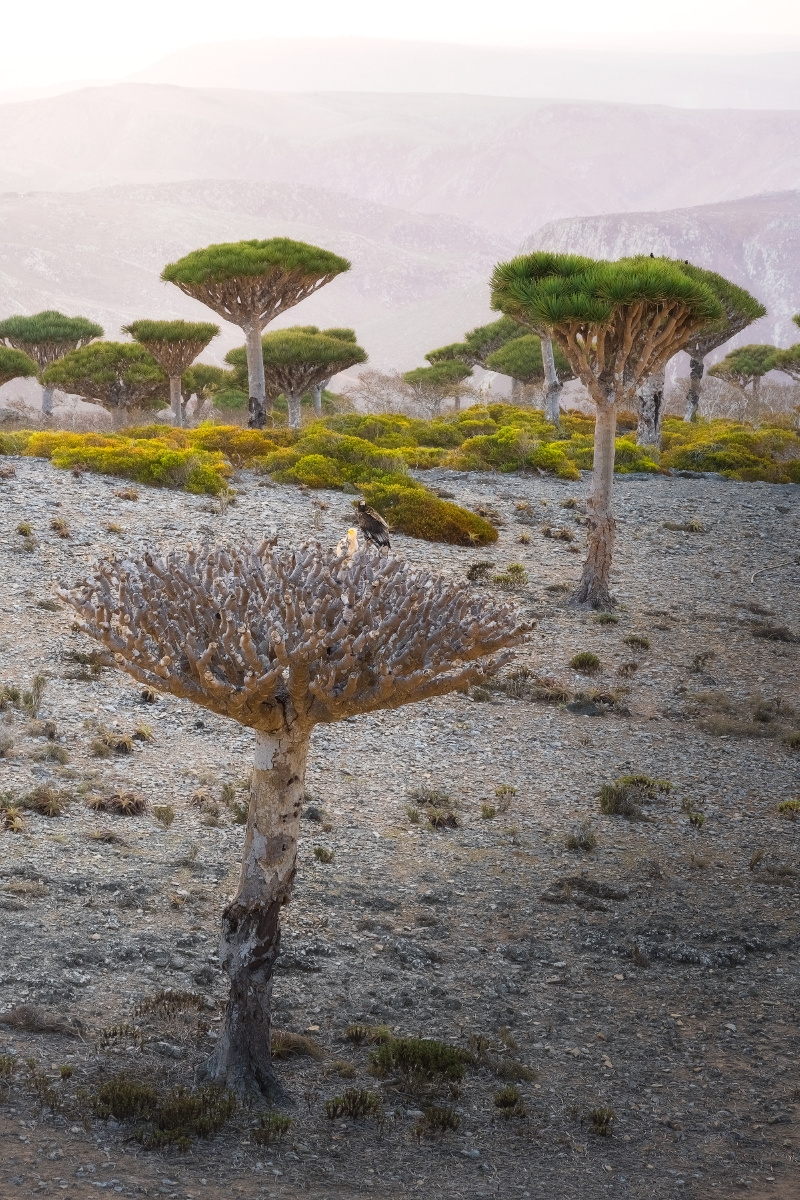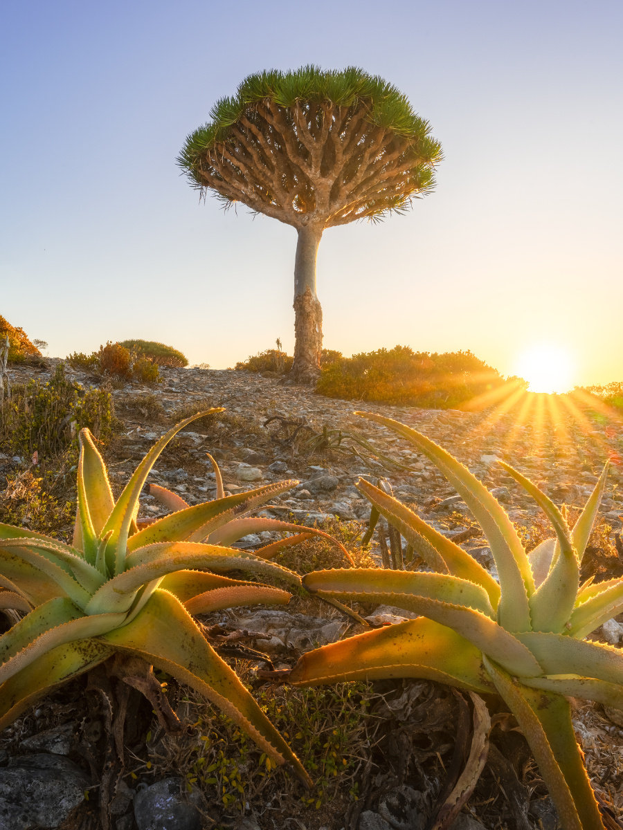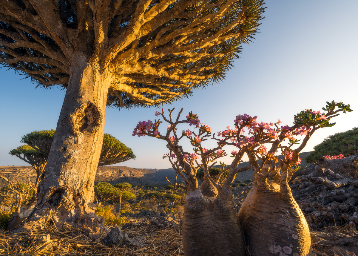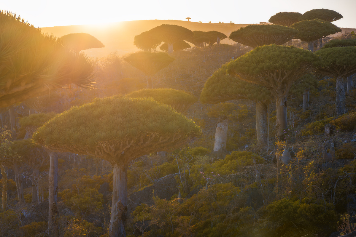 今年3月底4月初,我在神秘的也门(Yemen)索科特拉岛(Socotra Island)最美的花季中拍摄了8天,如同来到了塞尔达或异星的世界。 索科特拉岛位于阿拉伯海和亚丁湾的交界处,1800万年前从冈瓦纳古大陆上分离,从此开始它孤独的漂移。 和身侧的非洲大陆和环绕的印度洋比起来,这个小岛是那么渺小,像地球掉落的微不足道的碎屑。 它距离西边的索马里250公里,距离北边的也门340公里,孤悬于大洋之中,可谓与世隔绝。 岛屿长132公里宽50公里的土地上飞沙走石,烈日四季炙烤; 每年5个月的漫长风季中,狂风甚至让当地人无法迈出家门一步,船只无法靠岸,飞机无法降落,如同炼狱一般。 但另一方面,沿岸细腻的沙滩镶嵌着蓝得惊心动魄的大海,渔民在沙滩边都能捕到鱼儿,惬意地好似最初的伊甸; 高原上的森林里夜间会泛起海雾,甘甜的露水充盈在空气中,闪烁着璀璨的星光。 索科特拉岛的标志是龙血树和沙漠玫瑰,两种有着史前气质的巨型植物,如果从它们身后窜出一只迅猛龙或始祖鸟的话我不会感到惊讶。 首先,它们的寿命都有着惊人的尺度。在岛上的培育园里, 4年的龙血树只像个放在办公桌上的小盆栽,26年的龙血树也只不过是放在地上的盆景, 岛上漫山遍野4米高的野生龙血树需要生长2000年。沙漠玫瑰长到1米高也需要200年。 其次是它们奇特的外观。龙血树巨大的树冠像是一个外星飞碟,而树冠下盘根错节的树枝则像飞碟裸露在外的管道。 如果说龙血树长得还算基本相似的话,那么沙漠玫瑰就千奇百怪了,我怀疑岛上没有两株沙漠玫瑰是长得一模一样的。 “沙漠玫瑰”这个浪漫唯美的名字其实和它的外形不太相称,它们像被晒伤的臃肿的大胖子, 或拙劣的工匠制作失误的陶罐, 个个都歪瓜裂枣,滑稽可笑,唯有3~4月花季时头顶上盛开的粉色花朵让人觉得可爱和悦目。 更准确地说,索科特拉岛2008年被联合国教科文组织列入世界自然遗产, 原因就在于岛上生存的700多种动植物中,有大约1/3是世界上的其他地方所完全没有的。 千万年的独立演化,已使其接近于外星的独特。 而当比岛屿更古老亿万倍的星光照耀到这片砾石土地上时, 当银河在龙血树和沙漠玫瑰的树杈间穿梭和舞动, 我漫步其中,感觉自己成了一名迷失航向的宇航员,被丢弃在了陌生的外星球。 脚下踏着的坚实大地也不过是一粒宇宙间最微不足道的尘埃, 但却是一粒美得最惊心动魄、最让人感官得到满足的尘埃。