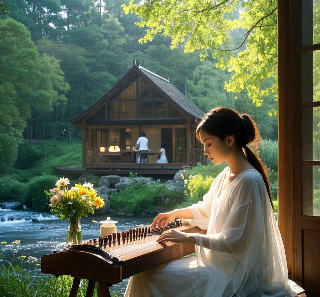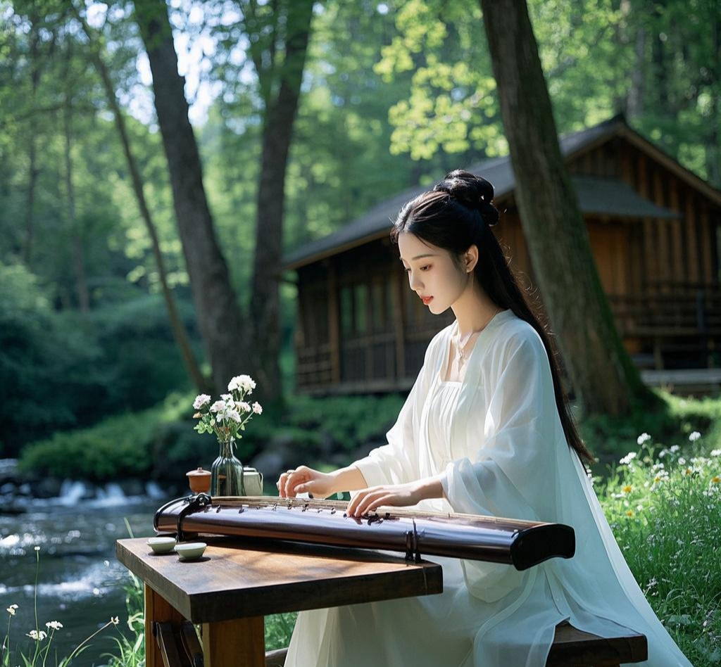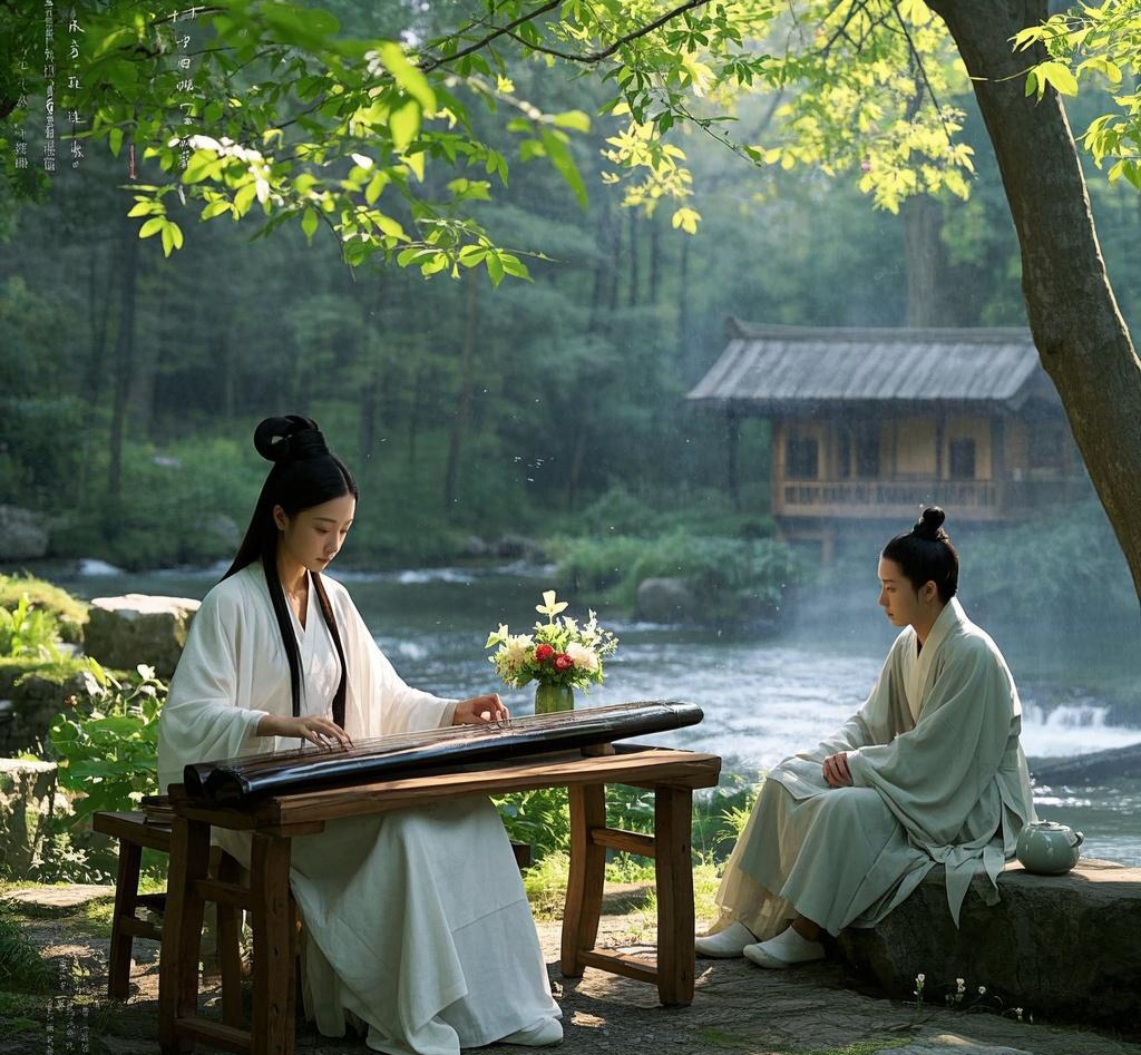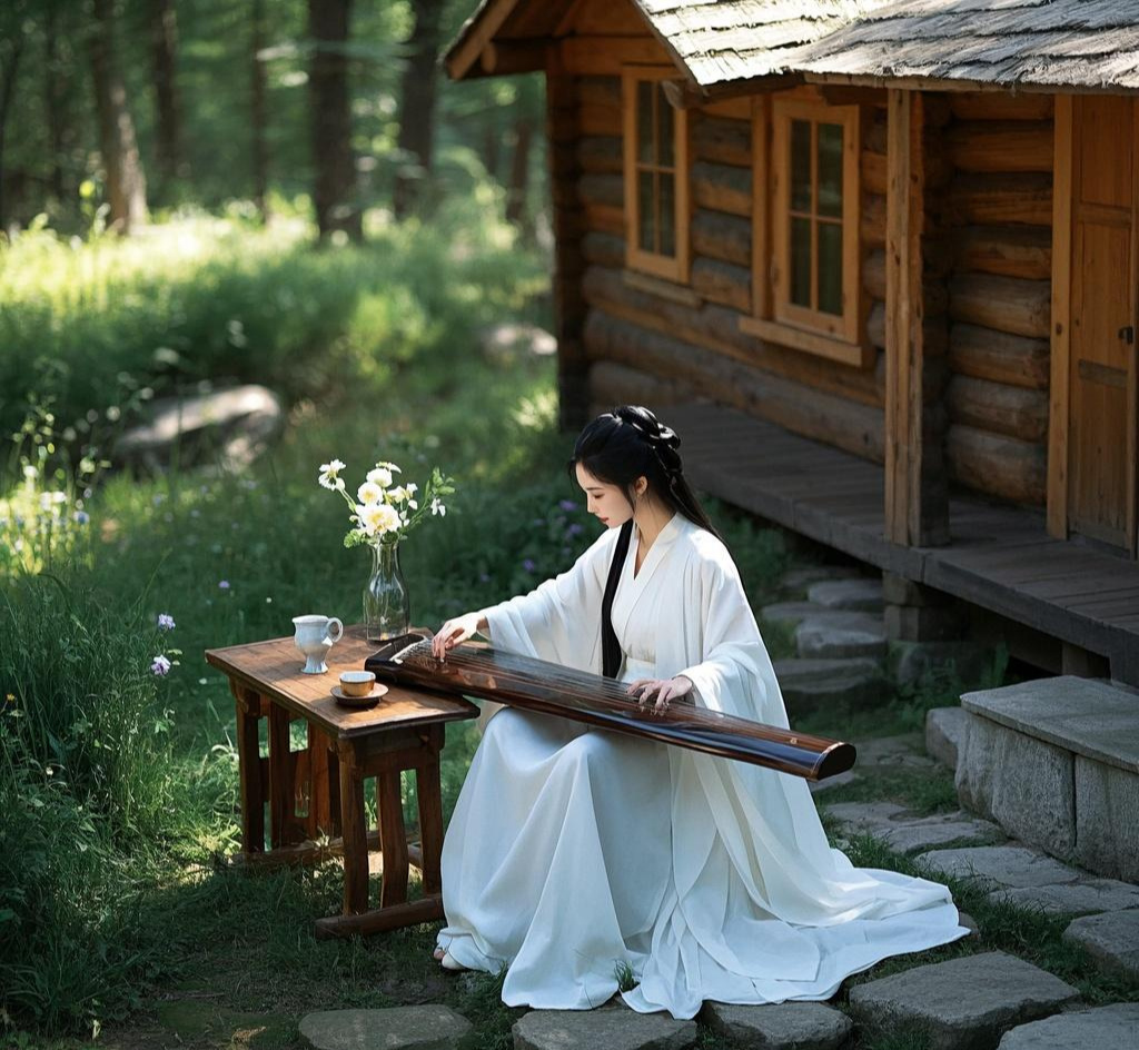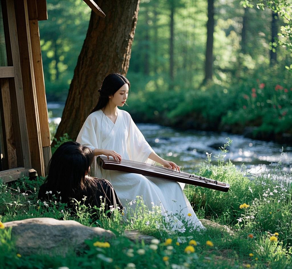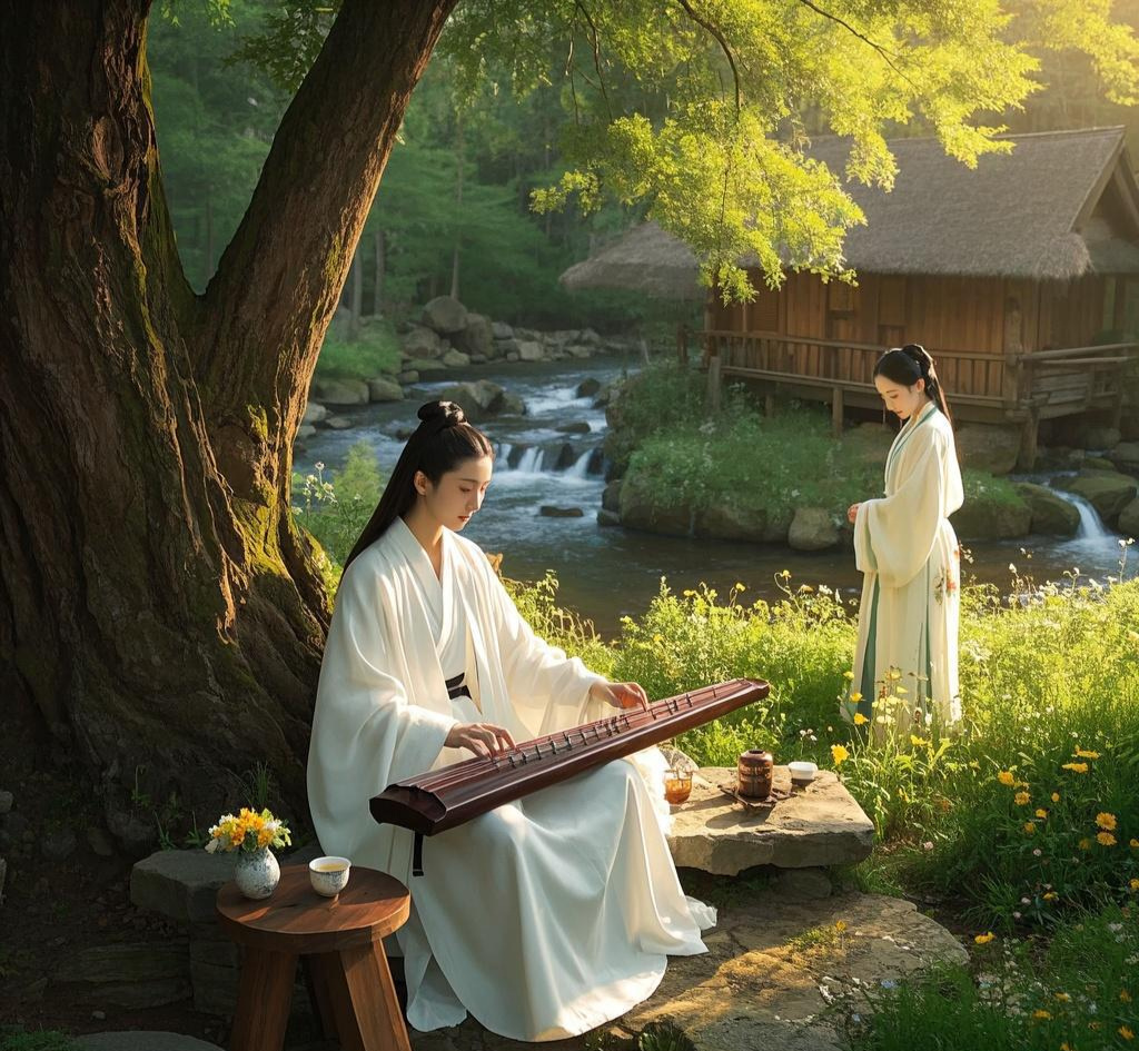 森林深处,阳光透过苍天大树的枝叶,洒下一片片斑驳的光影。一位白衣女子端坐在古琴前,指尖轻拨,琴声如溪水般流淌。她身后是一座古朴的木屋,旁边知己静坐,茶香袅袅。小溪潺潺,野花点缀,空气中弥漫着清幽与幸福的气息。女子占画面的五分之一,琴桌旁茶具与鲜花相映成趣,仿佛时光在这一刻静止,唯美而宁静。#一起拍春天 #中华地理风光大赏 #今日份摄影 #分享一个摄影小技巧
