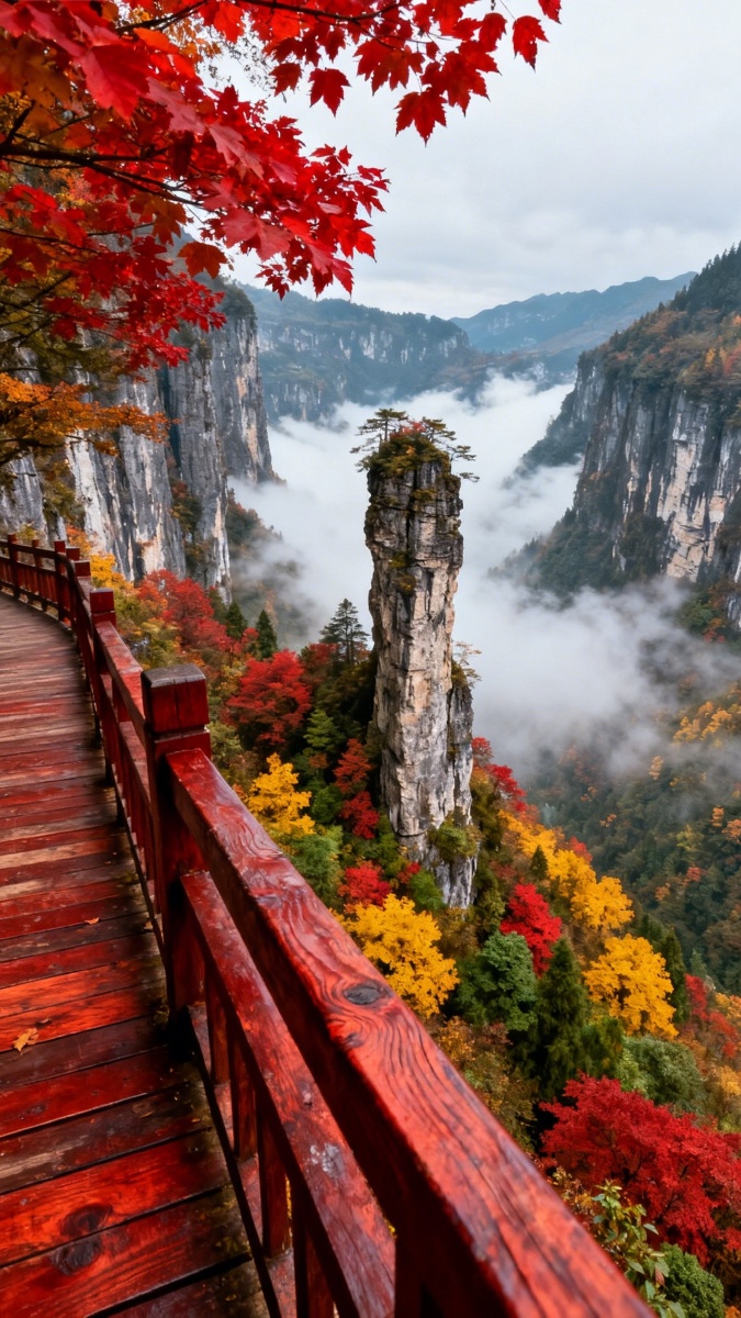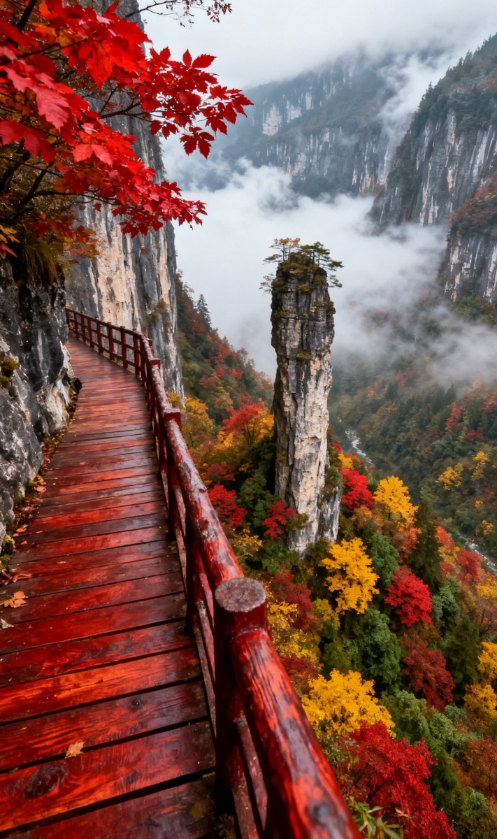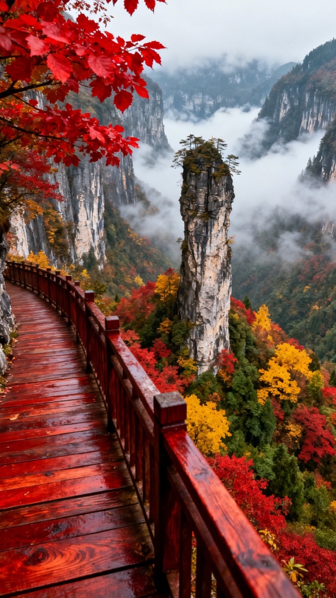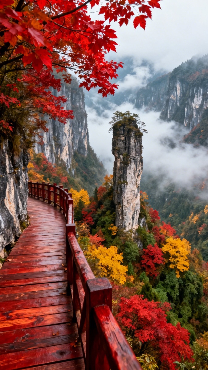 《秋日峡谷美到失语!红色栈道穿梭彩林云海,孤峰如柱立天地,这泼墨般的山水秋景绝了,堪称户外爱好者的天堂,不来打卡怕是要后悔一整年!》