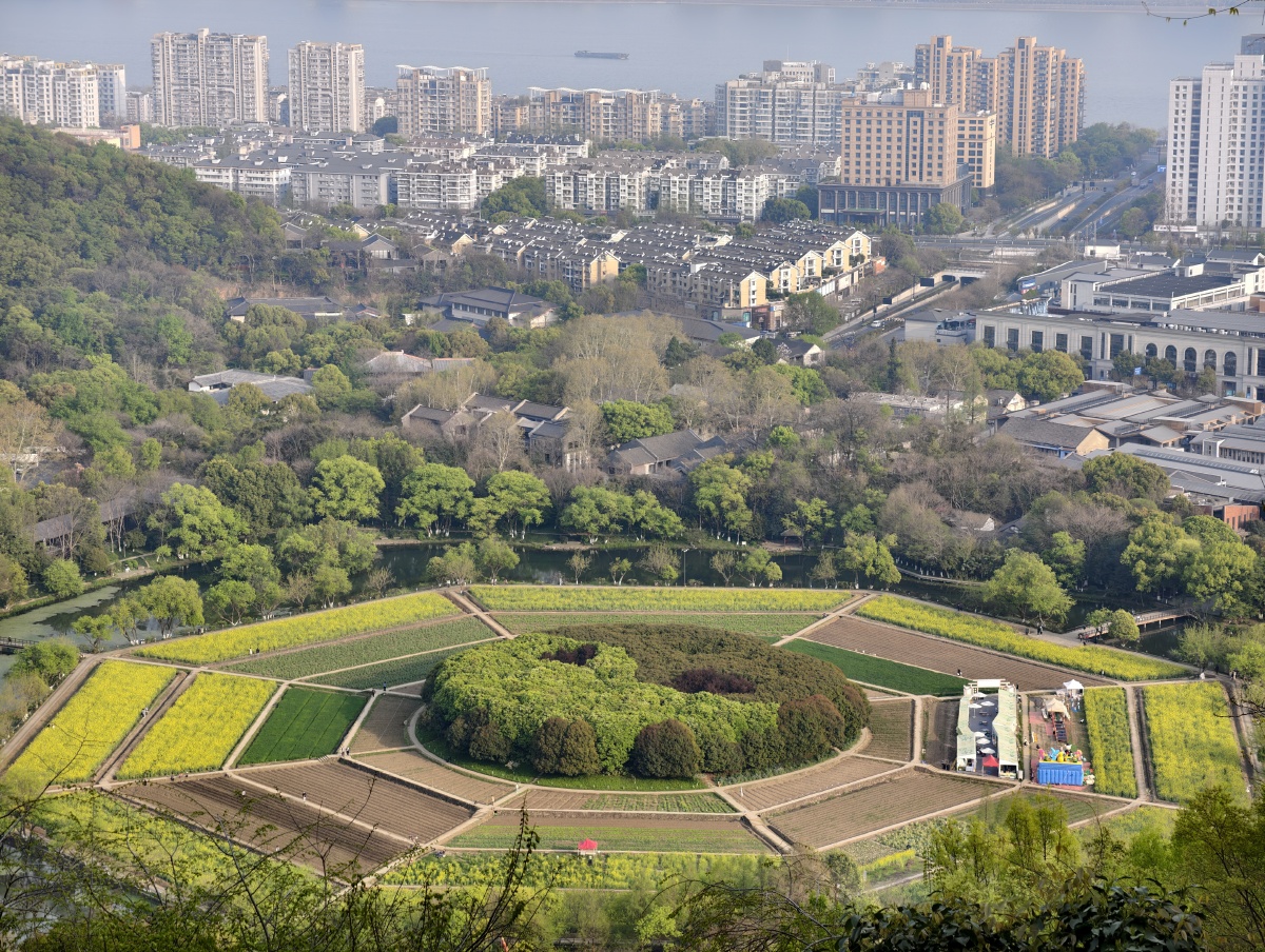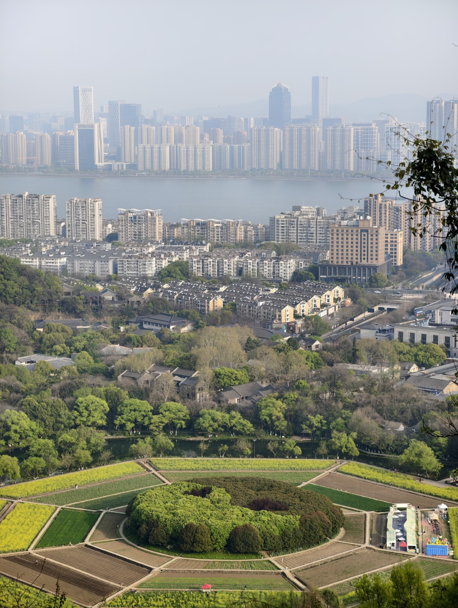 俯瞰城市,高楼林立于湖畔,现代气息扑面而来。城中绿树成荫,屋舍错落有致,勾勒出生活的烟火气。近景处,田园呈几何图案铺展,黄绿相间,生机盎然。城市与田园在此和谐交融,展现出独特的风貌,既有都市的繁华,又有乡野的静谧,似一首灵动的交响曲。