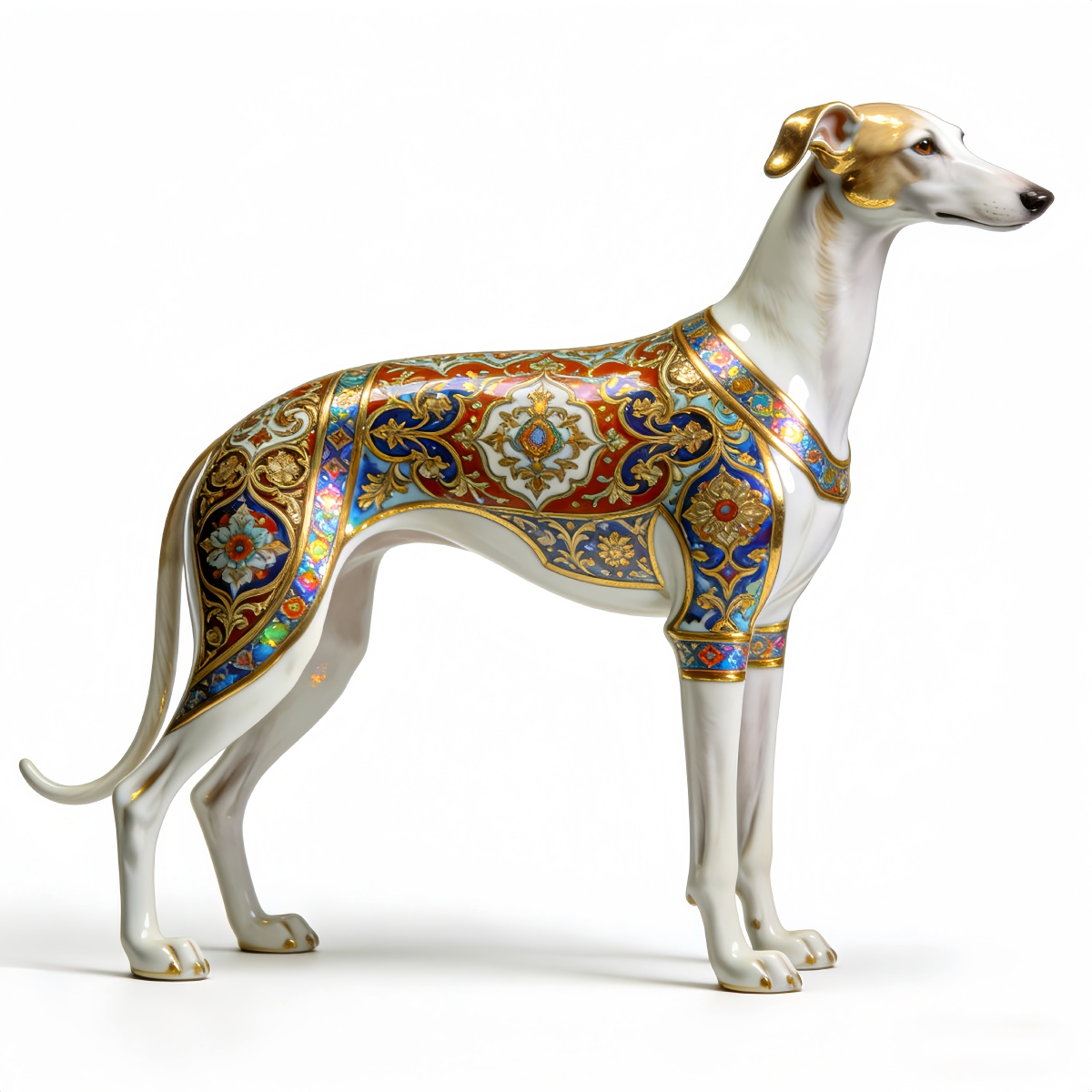 白瓷灵犬立清光,珐琅鎏金缀锦裳。 彩釉缠枝凝古韵,东方雅韵自芬芳。