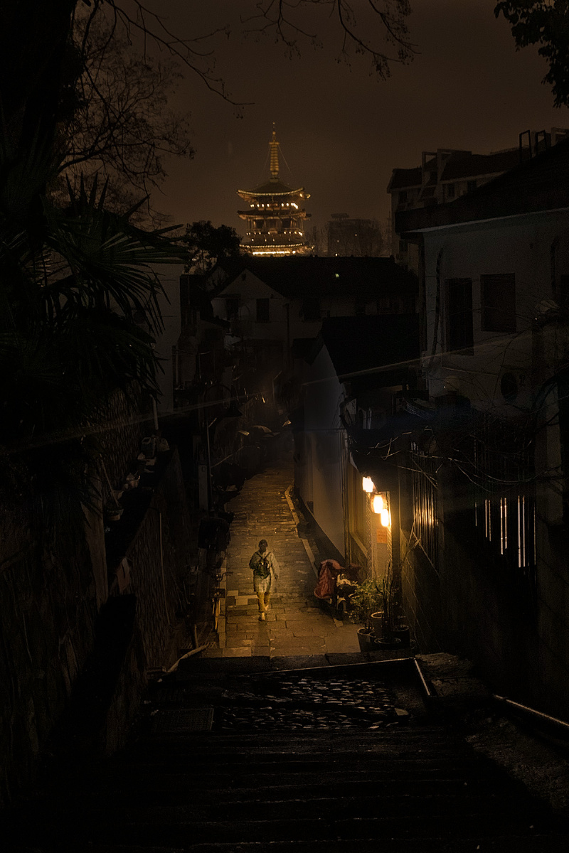 据说是个网红机位,手机拍摄。原意是拍摄远处的塔楼,但发现灯下匆匆行走的路人更有味道。我用Photoshop粗粗处理了一下,压暗了四周的景物,去掉了一些杂乱的亮光,降低了色温,让画面呈暖色调。就这样吧:)