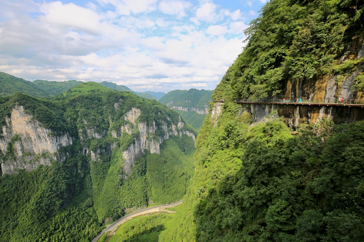 德夯大峡谷。“德夯”为苗语deut hangd(苗文)的音译,意为“美丽的峡谷”,是湖南省唯一集自然山水风光、苗族风情为一体的国家重点风景名胜区,属武陵山脉,距吉首市24公里。 德夯地处中国地势第三阶梯向第二阶梯爬升的临界点,地理断层造成了壮丽的峡谷地貌。 也基于这样的地理特征,100年来,这里先后创造了两个路桥史上的工程奇迹—— “矮寨坡公路奇观”和 “世界第一悬索桥”。