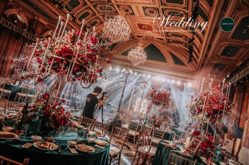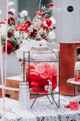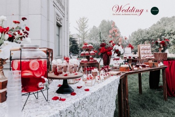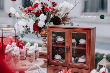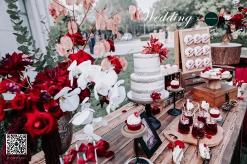 9.28红森系婚礼甜品台?? 整场婚礼甜品台以「Vintage红」复古欧式红森系的装饰风格呈现, 点缀的白色和裸粉色让整体凸显出那份自然融合。 少量的欧式花边及金色的元素的同时,也保留了中国传统元素。 甜品设计:大宫家烘焙公社&G.CAKE.STUDIO 摄影后期:大宫家烘焙公社